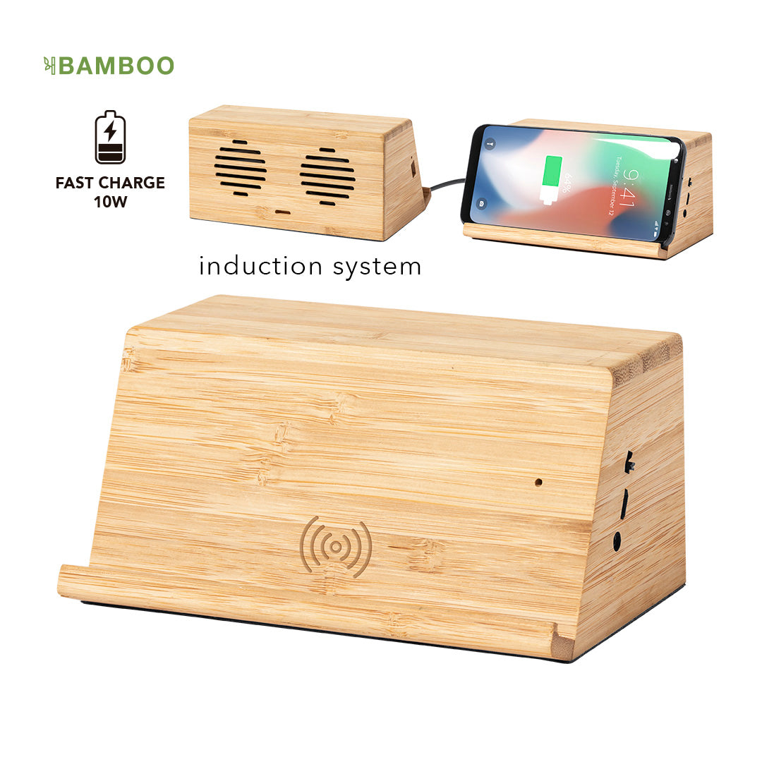 Nature line speaker with 10W wireless induction charger. Integrated smartphone holder and 2 speakers of 3W each. Made of bamboo from natural cuttings, with non-slip base. Compatible with devices equipped with wireless charging technology and rechargeable via USB cable -included-. Large branding surface and presented in an attractive eco-design box.