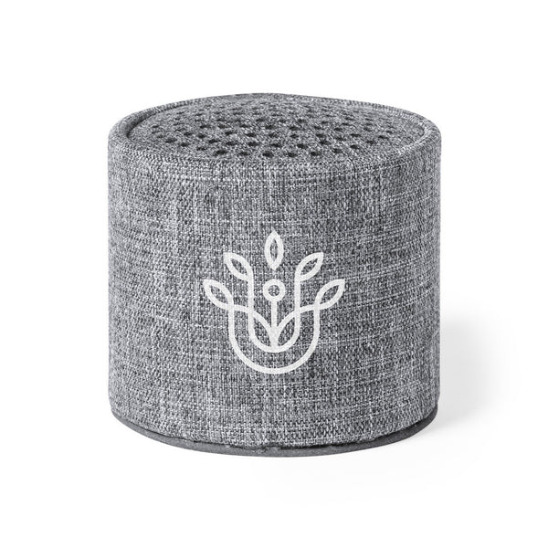Nature line, compact speaker with Bluetooth® 5.0 connection. Case in of RPET polyester, made from recycled plastic, in order to promote the reuse of plastic waste and help the sustainability of the planet. 3W power, compatible with iOS and Android and including micro USB charging cable and non-slip base. Presented in an attractive eco-design box. With RPET emblem on the item.