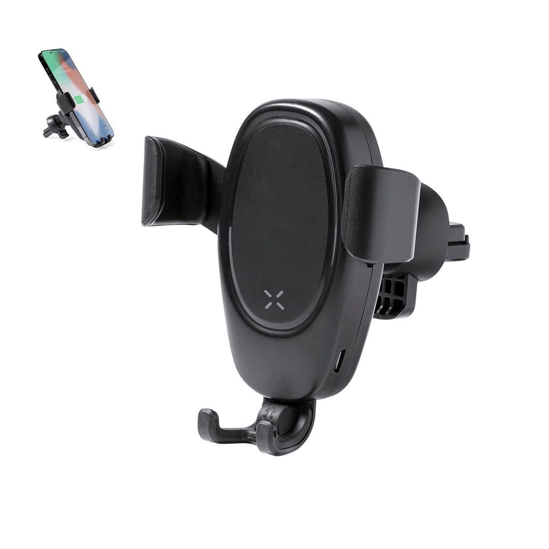 Car grill holder for smartphone with integrated 10W wireless charger. Universal, automatic adjustment mechanism to enable use of the device while charging. Compatible with devices equipped with wireless charging technology. Presented in an attractive, individual design box.