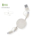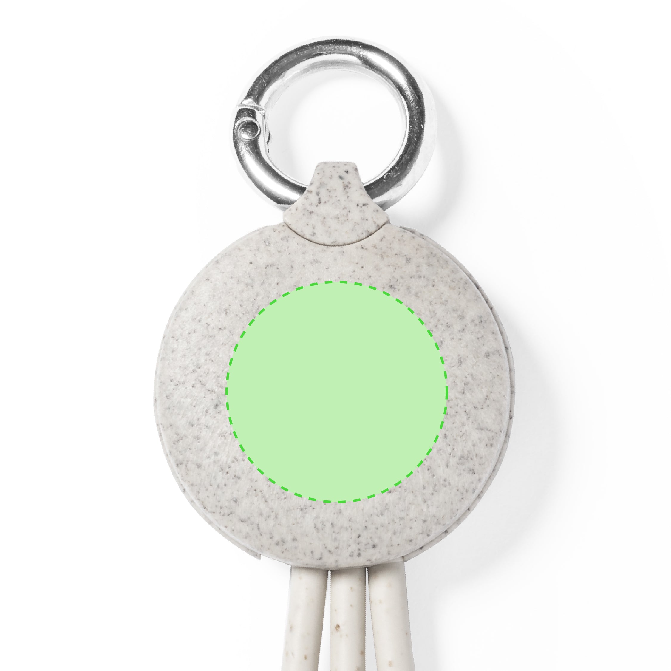 Charging cable with ring made in wheat straw, promoting the use of natural raw materials and reducing polluting emissions. Including Type-C and USB input connections Lightning, Micro USB and USB outputs. Presented in an individual kraft design bag.