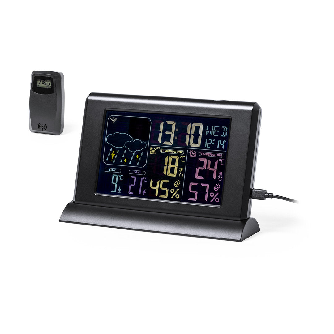 Premium, multi-function weather station, made in durable ABS with a satin black finish. Including backlit, easy-to-read display with colour graphics. With wireless, outdoor temperature/humidity sensor and integrated indoor temperature/humidity sensor. Alarm and calendar functions, with APP available - compatible with iOS and Android - for remote control via WiFi network adding extra functionalities. Power adapter and 1 m long USB cable included, with wall mounting bracket. External sensor with battery power supply (2xAAA not included). Presented in an individual Kraft design box, with instruction manual in English and Spanish.