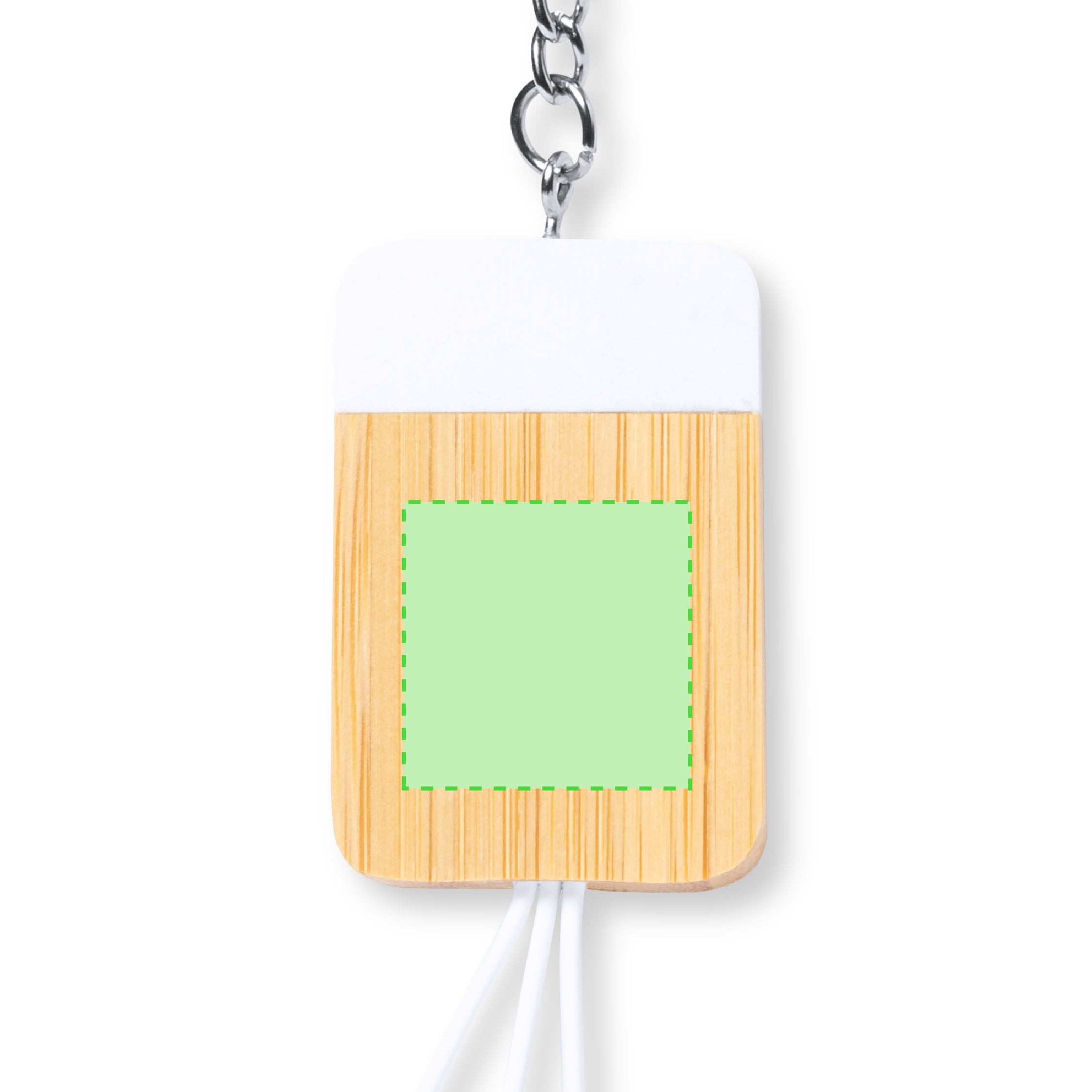Charger cable with keyring, made in bamboo with marble extract insert. Including USB and Type-C input connections, with Lightning, Micro USB and Type-C 5VDC 2.4A outputs. Presented in an individual kraft design bag.