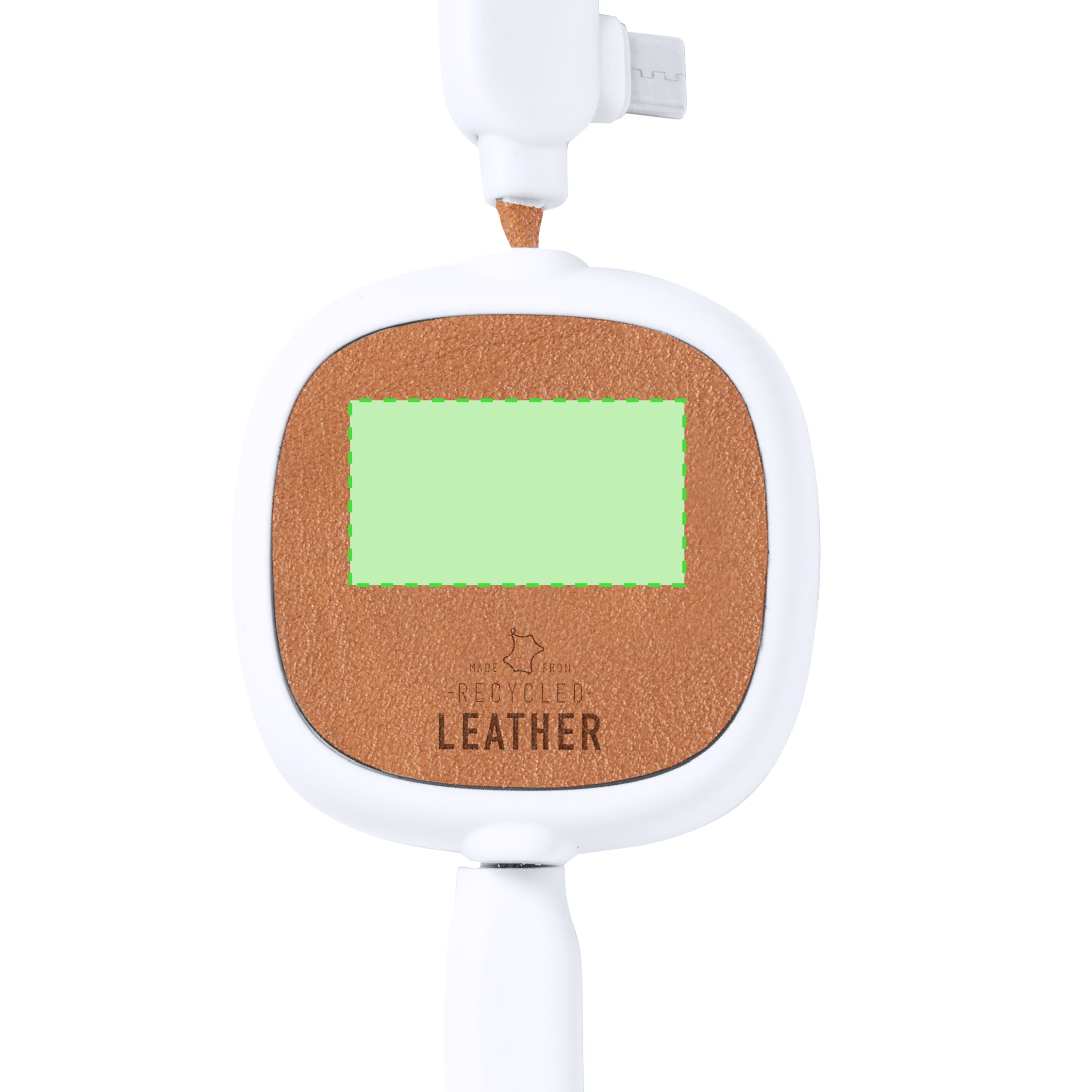 1m extendable charger cable, made of RABS and in elegant white, with recycled leather cables and details.Centre piece with recycled leather cover and internal mechanism making the cable extendable. With Type-C and USB input connections and Type-C, Lightning and Micro USB outputs. 5V DC 2.4ARABS or Recycled ABS material and recycled leather come from the recycling of items at the end of their lifespan. The recycled materials used include RCS certification, which guarantees their recycled origin.