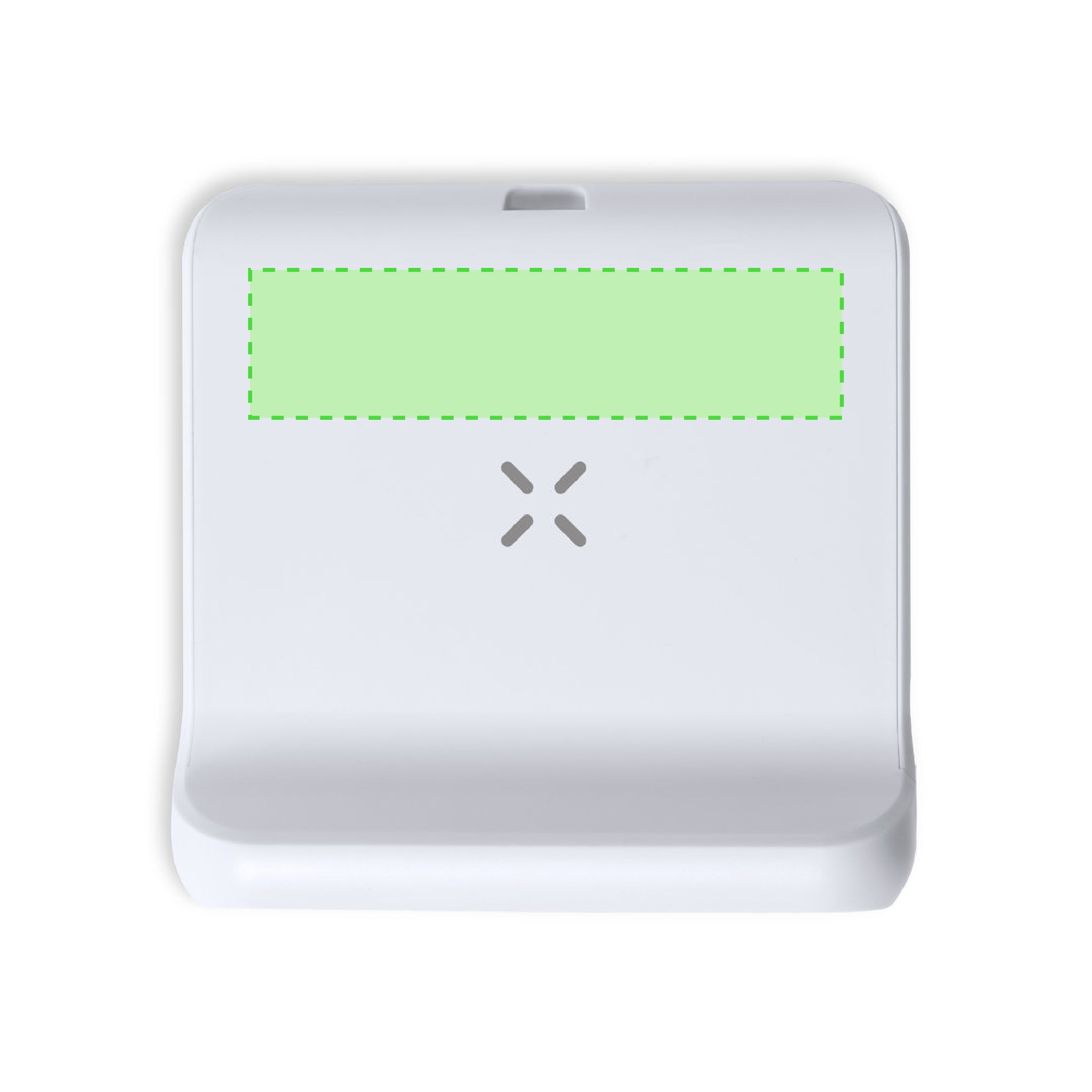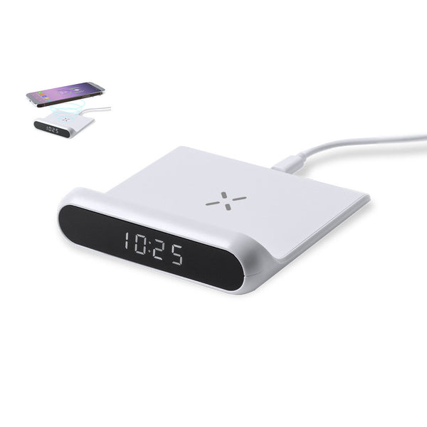 Multifunction clock with backlit display and integrated 10W wireless charger. In elegant white design, with time and alarm functions. 1m Type C charging cable included, and compatible with devices equipped with Qi wireless charging technology. Presented in an individual kraft design box, with instruction manual in English and Spanish.Manufactured according to RoHS standards and in compliance with the following safety requirements:Overheating protection system.Over-charge protection system.Blocking system to prevent short circuits.