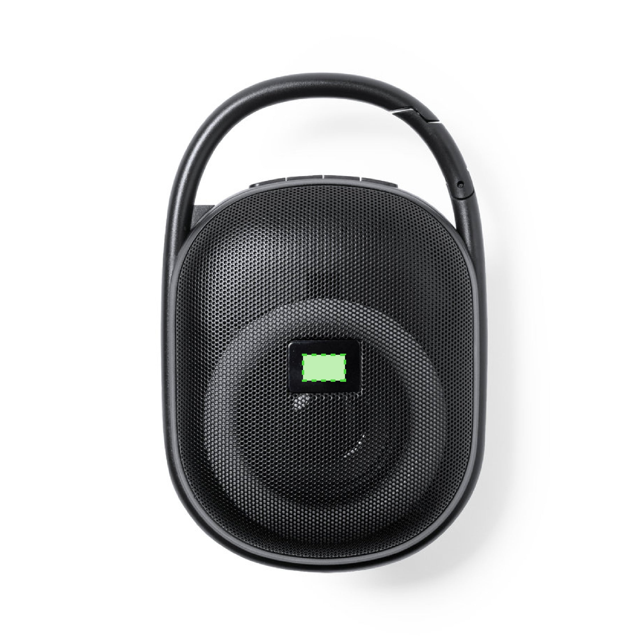 Powerful 5W Bluetooth® speaker with multicolour light. Portable and made in durable ABS material in matt black, with integrated grille and hanger. With multicolour LED lights and 5 lighting positions. Bluetooth 5.0 + EDR connection (Ehanced Data transmission Rate). Integrated control panel on top of the speaker and full connectivity, with hands-free function, USB port for playback from a USB stick, micro SD card slot (up to 32GB) and FM radio function. With 1,200 mAh lithium battery and Type-C charging cable included. Integrated badge on the grille for easy branding and presented in an individual kraft design box, with instruction manual in English and Spanish.