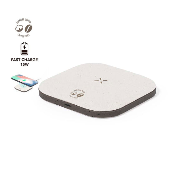 Wireless charger made of coffee fibre and recycled cotton. Non-slip base and compatible with devices equipped with Qi charging technology. Charging capacity of 15W, with Type C cable included in black color. Coffee fibre and recycled cotton logo. Presented in an attractive kraft design box, with instruction manual in English and Spanish.Coffee fibre is a circular solution that is obtained from the use of the waste produced in the production of coffee. A sustainable alternative that favours the reduction of the use of plastics, saving energy in its manufacturing process and contributing to the care of the environment. GRS (Global Recycled Standard) certification is available, which guarantees the recycled origin of the material used to manufacture the product.