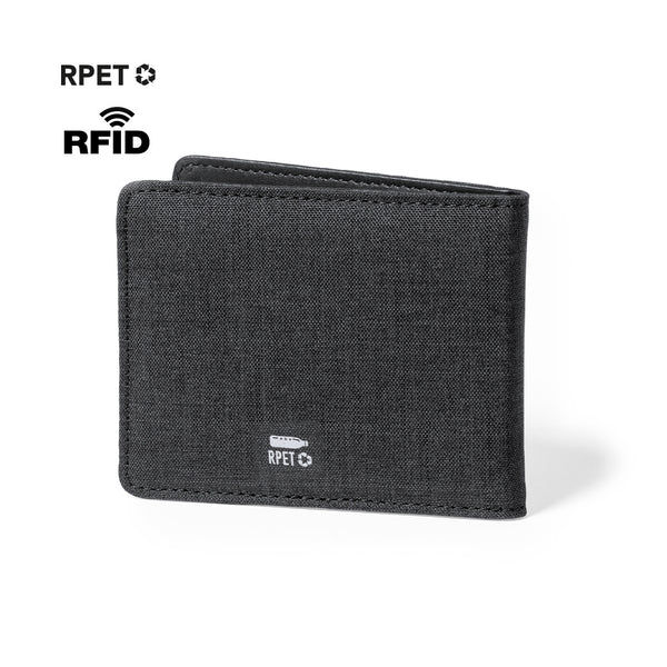 Elegant wallet and card holder made of RPET polyester with black finish. Inside with 6 independent compartments for cards and large wallet. RFID (Radio Frequency Identification) security technology that keeps card data safe. With the distinctive of RPET outside and the RIFD inside.RPET material is made from recycled plastic, to encourage the reuse of plastic waste and help the sustainability of the planet.
