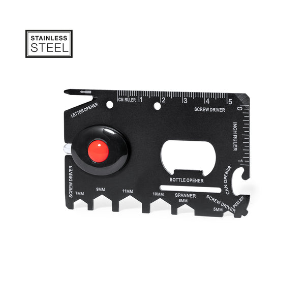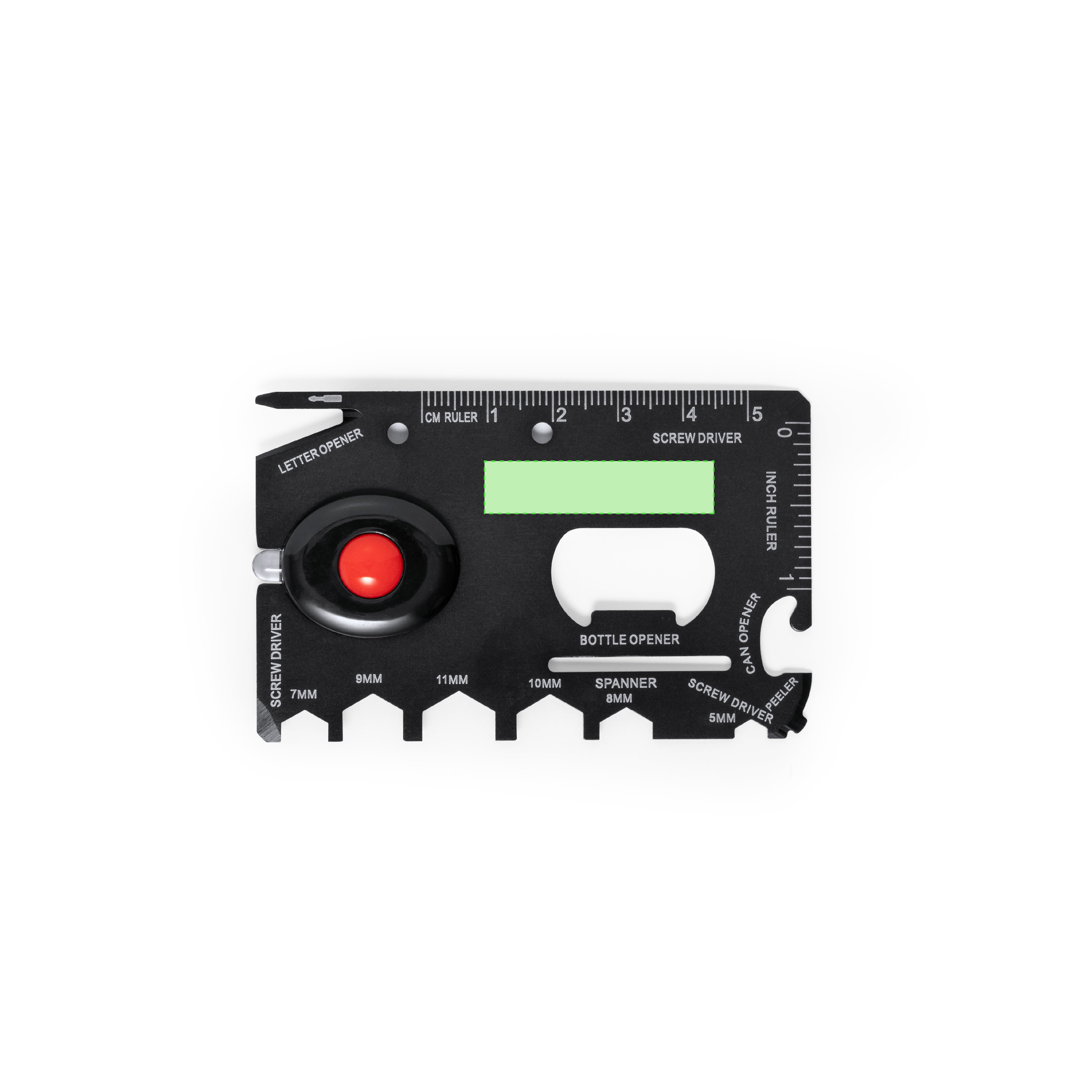Handy multi-tool made of stainless steel and finished in black. Flat card-shaped design with 16 functions: flat screwdrivers, letter opener, ruler in cm and inches, bottle opener, can opener, peeler, spanner for hex nuts in various sizes and torch (button battery included). Presented in an individual bag made of recycled paper.
