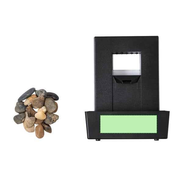 Portable, endless water fountain with LED lights. Water cascade over natural stones, ideal for decoration or relaxing moments. Including a water tank and a structure lit by LEDs in natural tones, flowing water through it. Powered by 3 AA batteries (not included). Presented in a kraft design box.