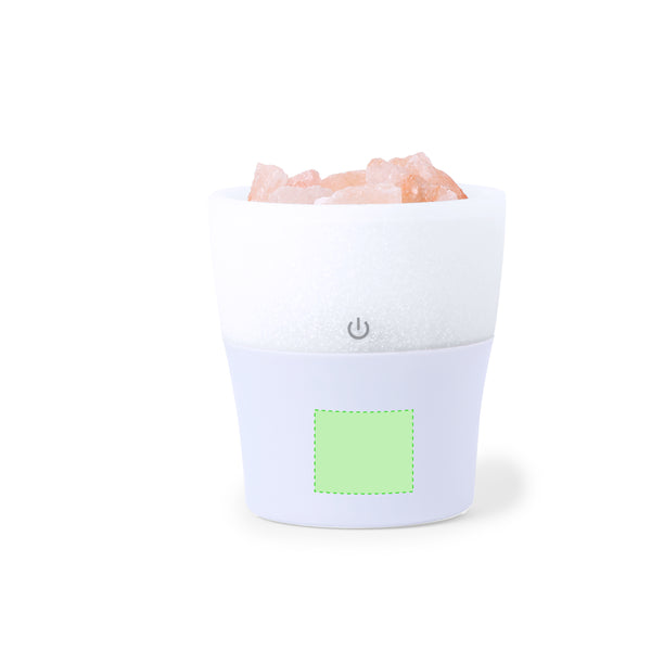 Elegant and decorative humidifier with integrated aromatic diffuser filled with Himalayan salt. With multicolour LED lights and continuous vaporisation. 150 ml tank, for use in rooms up to 25m2, and USB power cable. Including 10 ml of lavender scent and presented in a kraft design box.