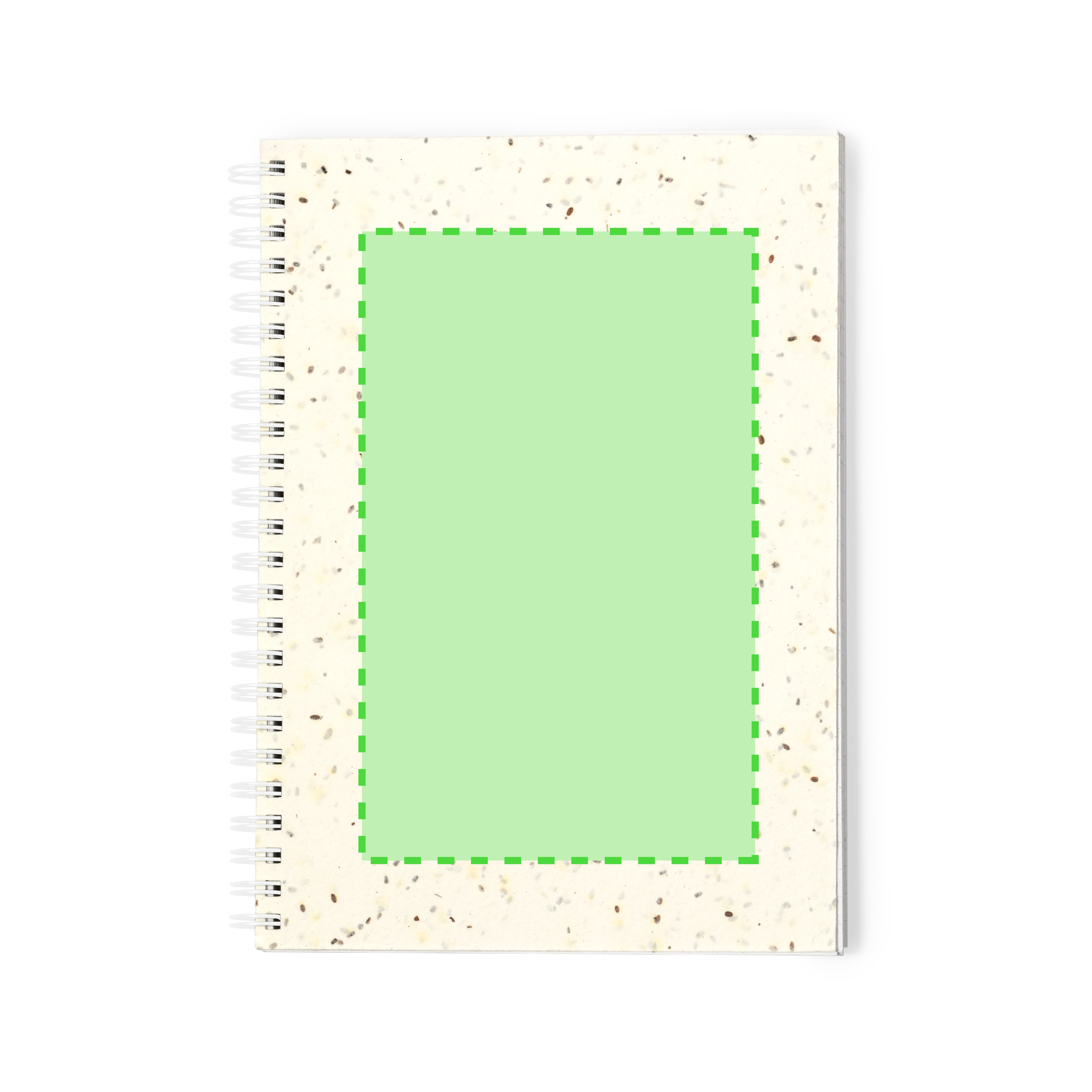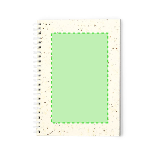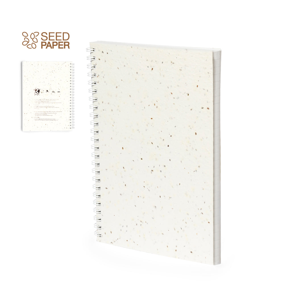 Ring binder notebook with soft covers made of seed paper. With 80 plain white sheets. The covers include petunia seeds, making it plantable paper at the end of its lifespan. Including planting instructions on the back cover and presented in an individual recycled paper bag.