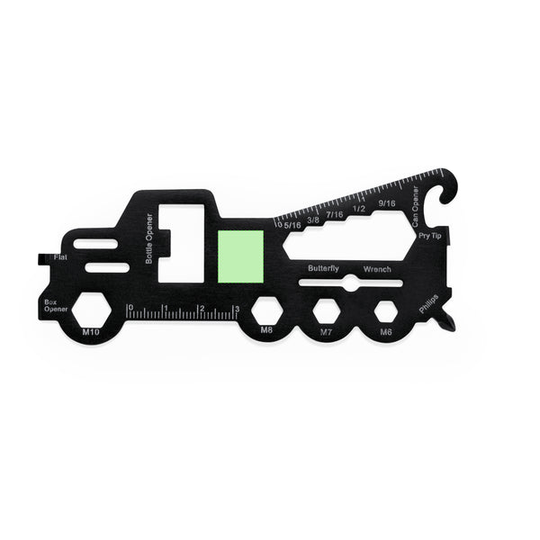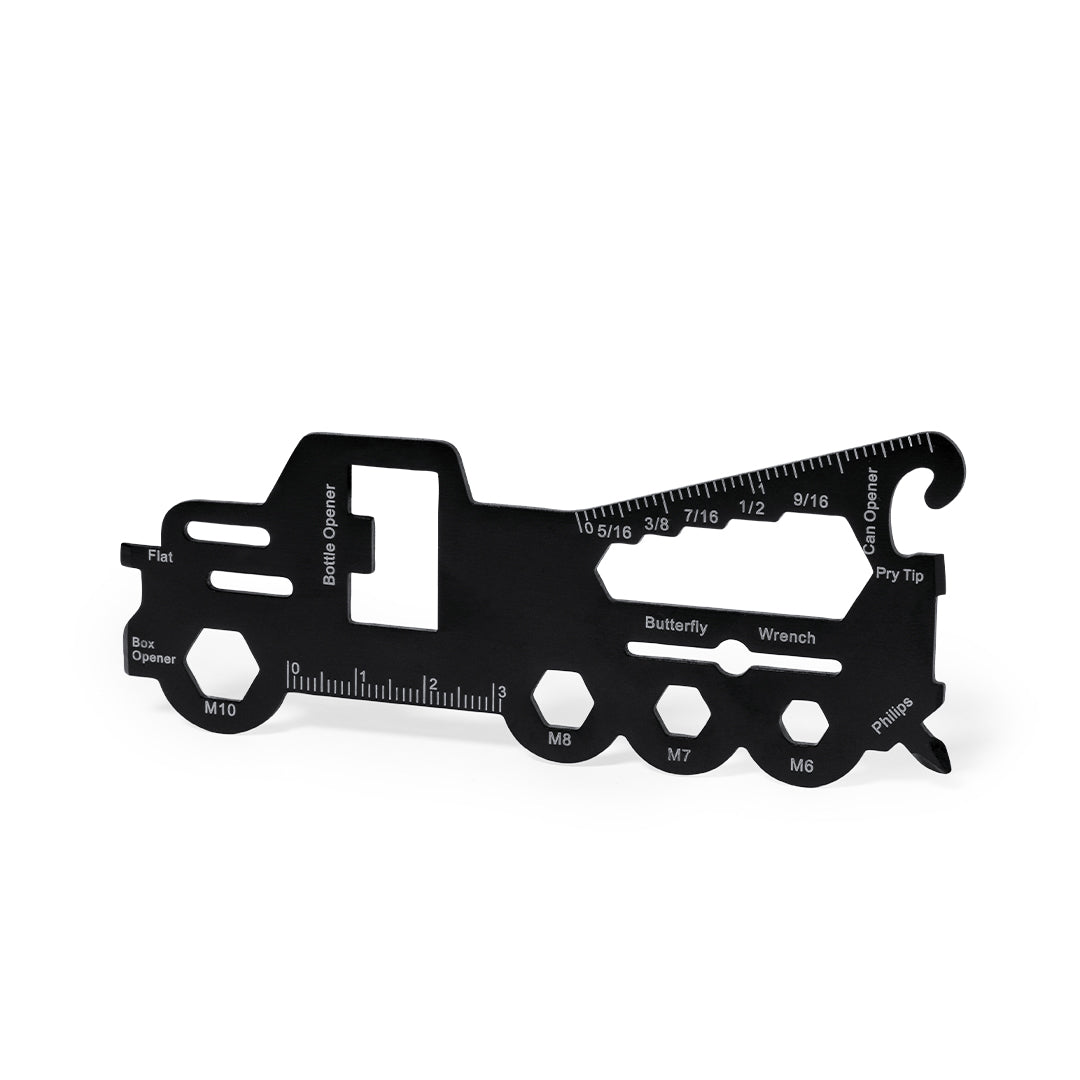 Cool and practical stainless steel multi-tool in the shape of a truck. With 18 functions, among others: flat and philips screwdriver, hexagon spanner in various sizes, ruler, box opener and bottle opener. Presented in a Recycled paper bag.