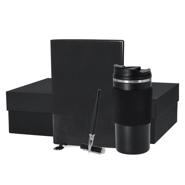 Elegant premium set including:470 ml capacity, double walled stainless steel thermos tumbler in elegant black. With matching lid dispenser and easy-opener, BPA-free, matching silicone band and non-slip base. Soft cover notepad made of smooth PU leather in an elegant black colour, combining smooth and bevelled textures. Including fabric bookmark and a special metal plate for laser engraving. Inside with 100 sheets, in cream colour, with single-striped layout and black edges.Roller pen in matt black finish with silver metallic details. Bevelled barrel, hooded, clip and in blue ink. It includes a comfortable grip made from polished metal.Set presented in an individual matte-finish case, with inner die-cutting for each of the elements of the set.