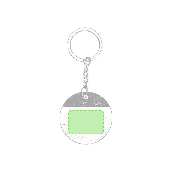 Round shape key ring, made in natural wood and with an original bicolor finish. Large branding surface, with metal ring and chain, and Made In Europe logo.