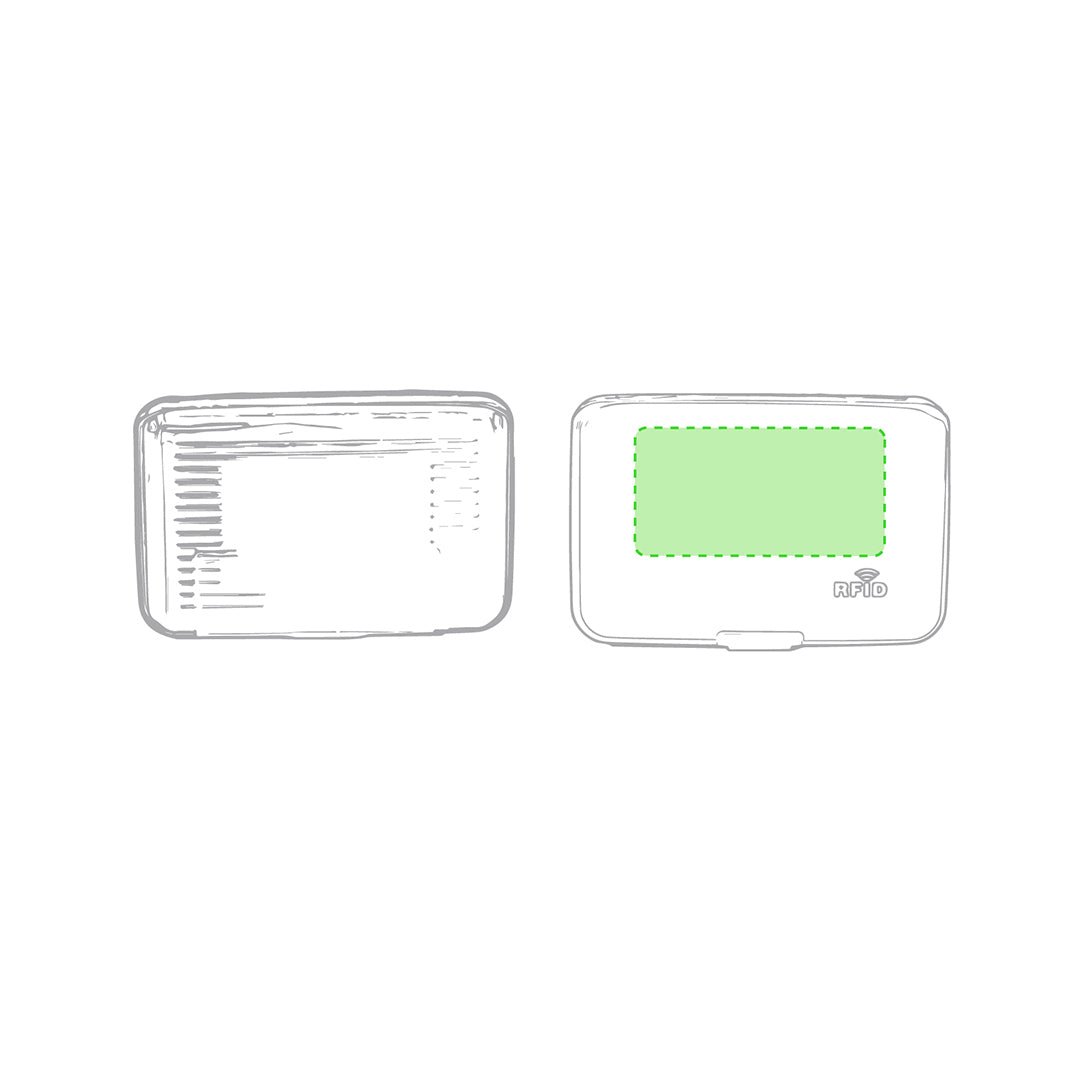 Card holder with RFID (Radio Frequency Identification) security technology that keeps card data safe. Resistant aluminum design, with 6 compartments and plain area on the outside designed for laser printing.