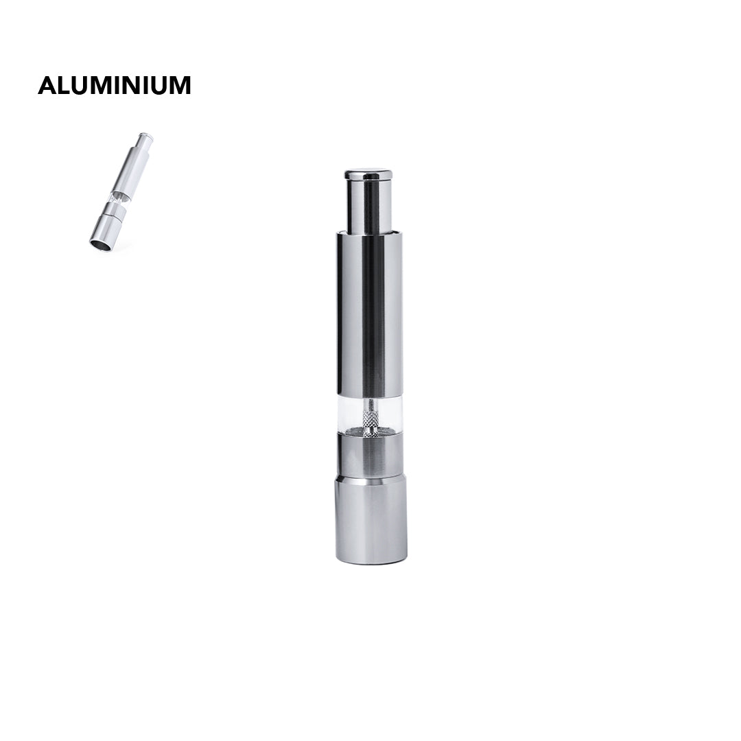 Manual salt and pepper mill made of Aluminium. Ideal for adding the desired spice, by using the manual push-button grinder. With a window to view the spice level. Presented in a kraft design box.
