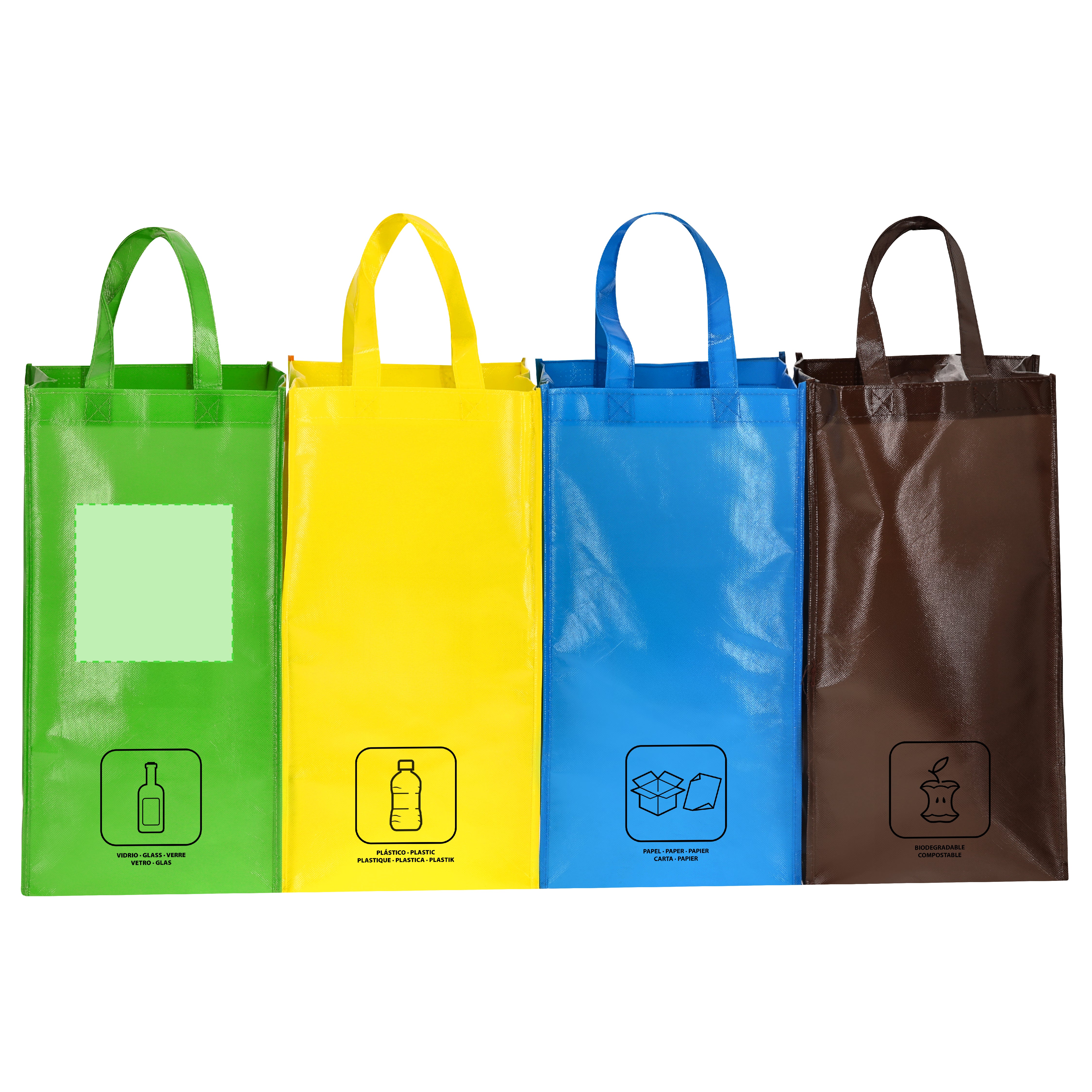 Set of 4 yellow-green-blue-brown recycling bags in resistant Non-woven laminate of 125g/m2 with a glossy finish. Includes 3 bags of 23x45x23cm joined together by resistant side velcro. With reinforced handles and indication of types of waste: plastic and packaging, organic, glass and paper.