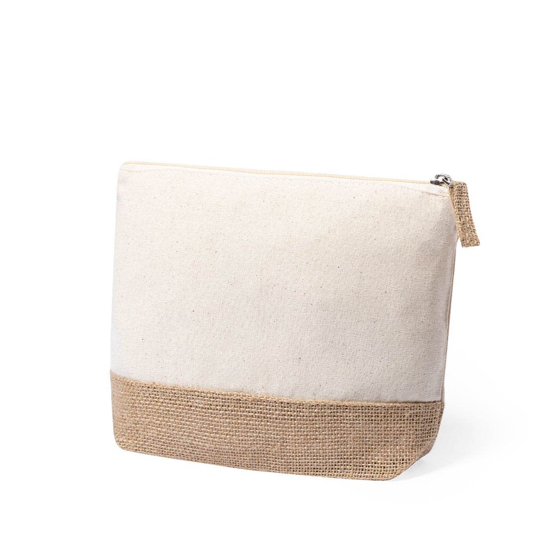 Nature line beauty case in combination of laminated jute and natural cotton. With zip closure and matching jute puller.