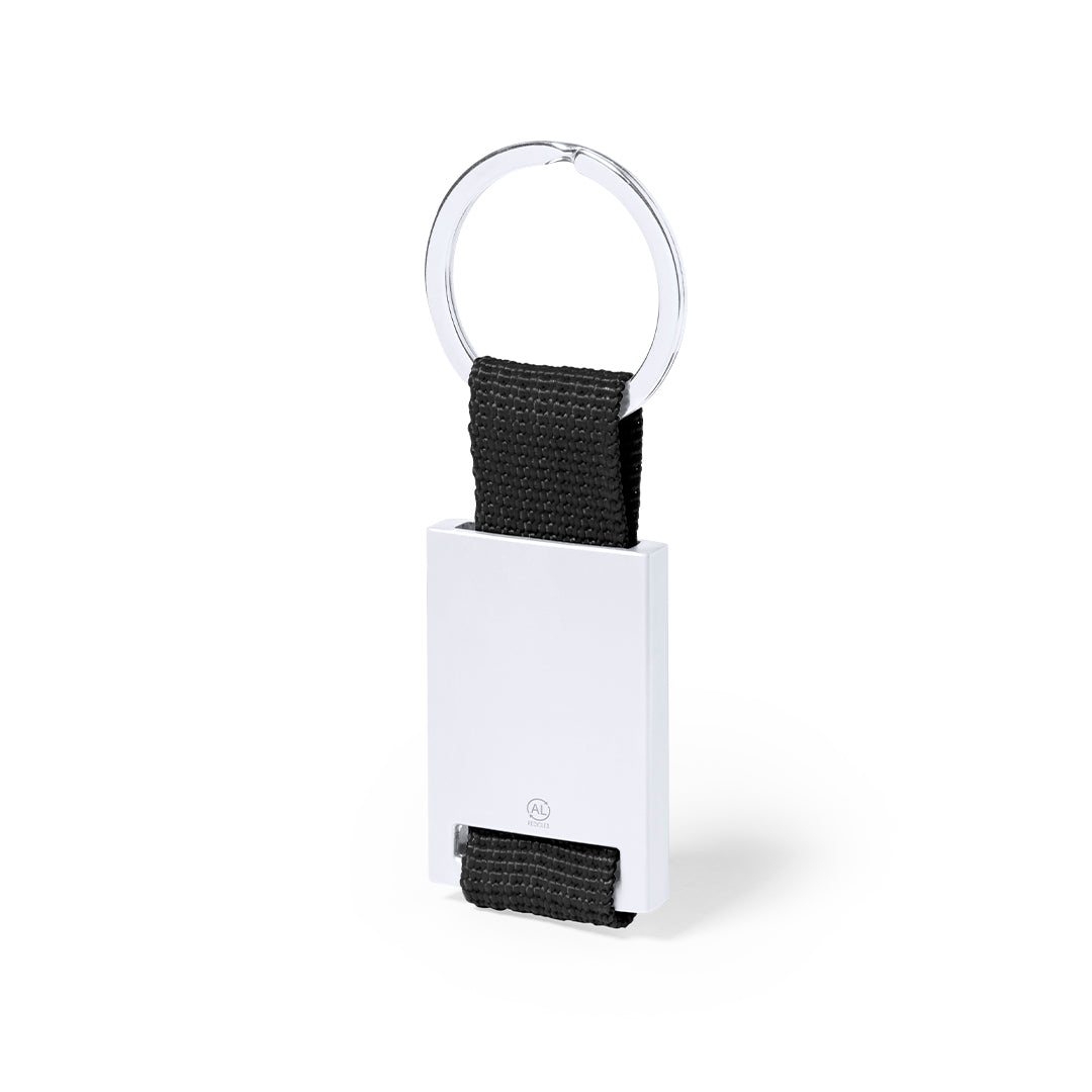 Keyring in recycled aluminium with silver finish and colour ribbon. Wide branding surface, with the recycled aluminium distinctive. Matching metal ring and presented in an individual bag with kraft cardboard insert.Recycled aluminium is a material with almost infinite recycling possibilities, with no loss of its original properties and less energy consumption in the process.