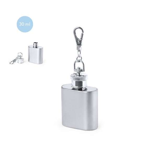 Handy flask keychain made in stainless steel, with 30 ml capacity. Lid with screw-on security lid and swivel hook. Presented in an individual, kraft design box.