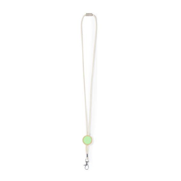 Lanyard made of resistant cotton and bamboo. Special round accessory for customisation made of bamboo, and security neck closure made of wheat straw. With swivel metal carabiner.Materials such as bamboo promote the use of natural raw materials, thus reducing pollutant emissions. It comes from a highly resistant and versatile plant, with rapid growth and regeneration, making it an excellent alternative to the use of traditional wood.