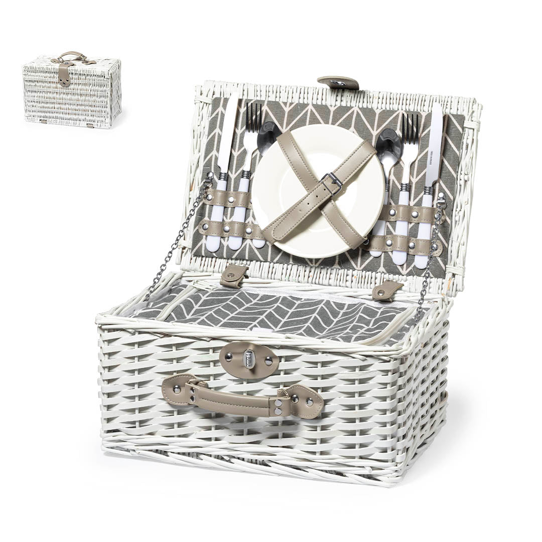Bring style to your picnic moments with this cool set. Picnic cooler basket in white finish, with gray handles and adjustable straps. Ideal for two people due to its two full services and multiple accessories. Including original a bold design cooler bag, with isothermal aluminum inside.