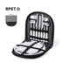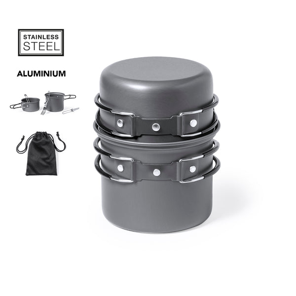 Complete set of camping utensils in an ultra-compact size. Presented in a resistant RPET pouch with drawstring closure, adjusting accessory and outside label with the RPET distinctive. Contents:1 aluminium pot in matte finish grey aluminium. 800 ml capacity 13 cm diameter x 10 cm height. Folding handles with burn protection.1 aluminium saucepan with matte finish. 600 ml capacity 12 cm diameter x 6.5 cm height. Folding handles with burn protection.Folding spoon, knife and fork, made in stainless steel. With die-cut handle and safety locks. Presented in an individual RPET pouch with drawstring closure. RPET material is made from recycled plastic, to encourage the reuse of plastic waste and help the sustainability of the planet.