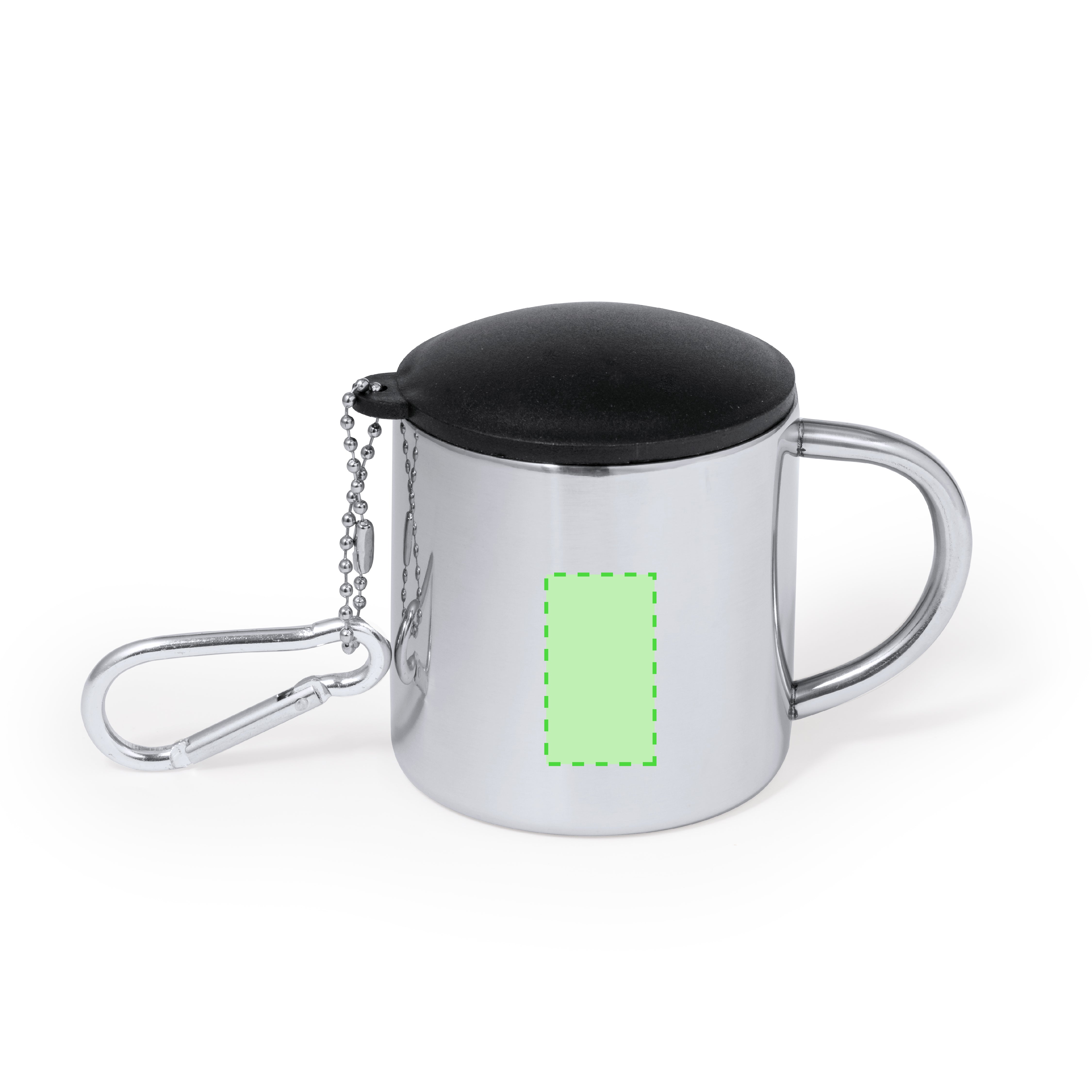 145 ml stainless steel double wall mug. Shiny design, with black press-on lid and optimal sealing due to the silicone ring. including a practical carabiner for easy transport and is presented in an individual kraft design box.