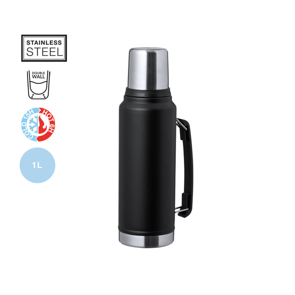Stainless steel thermos with a capacity of 1L. Combination of black colour and polished steel, elegant finish, and screw lid with tumbler function and 200 ml capacity. Handle on the side for easy carrying and presented in a kraft design box.