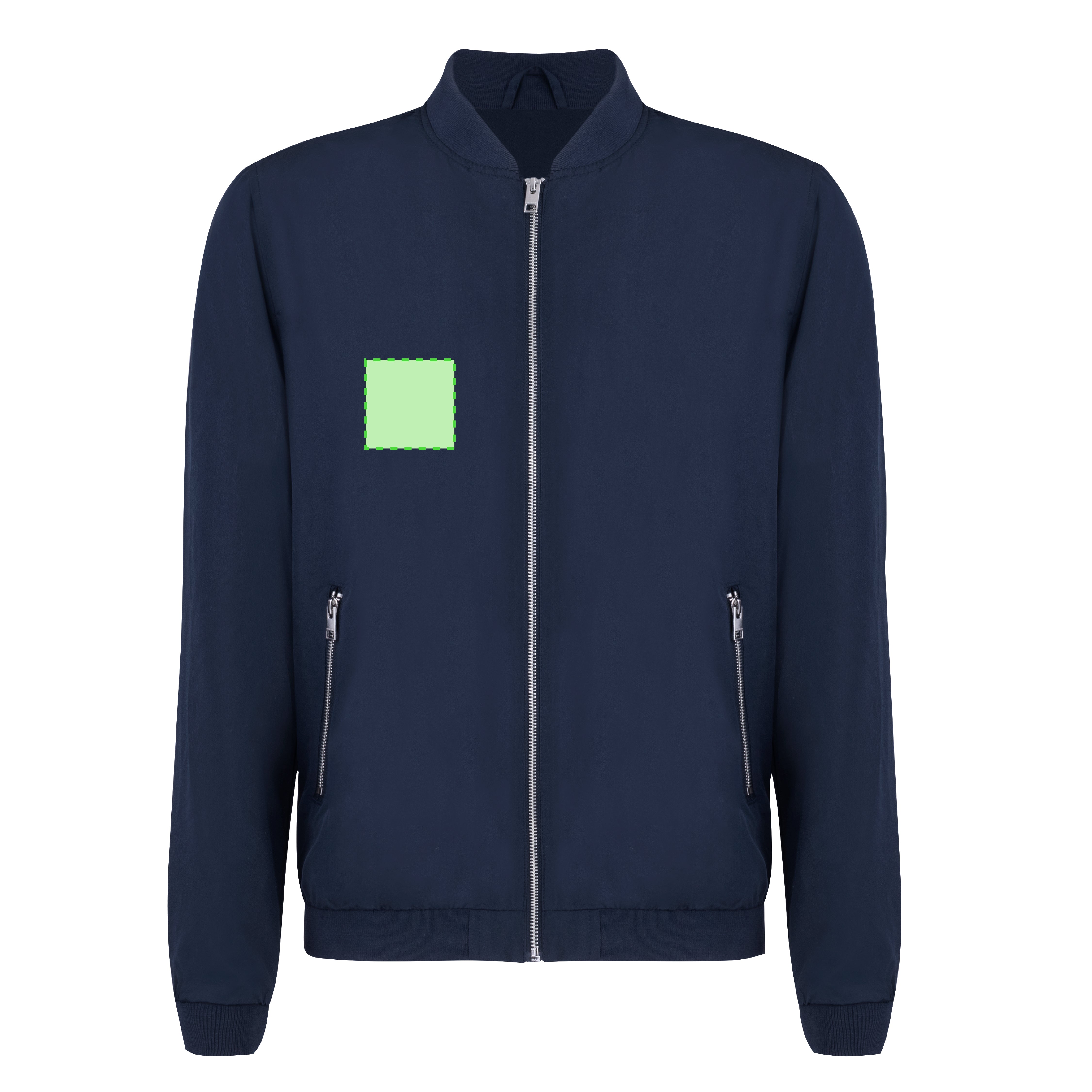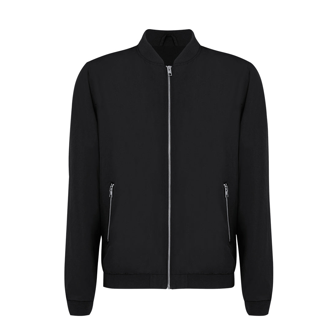 Trendy and lightweight bomber jacket with baseball collar. Made in warm polyester with inside lining, wind and water resistant. In stylish navy blue and brown colours, with chrome style zips on front and pockets. Elastic cuffs and hem. Sizes XS, S, M, L, XL, XXL.