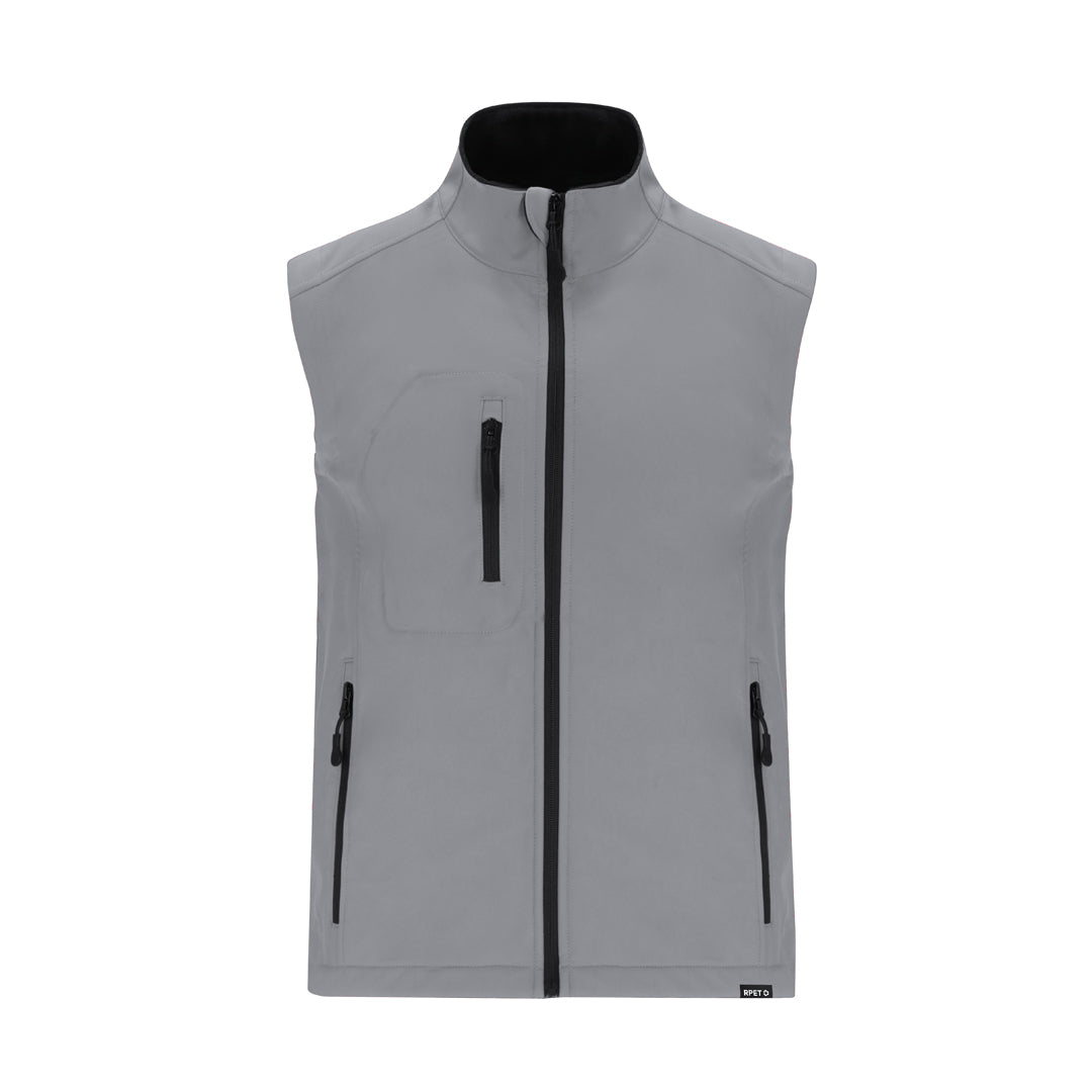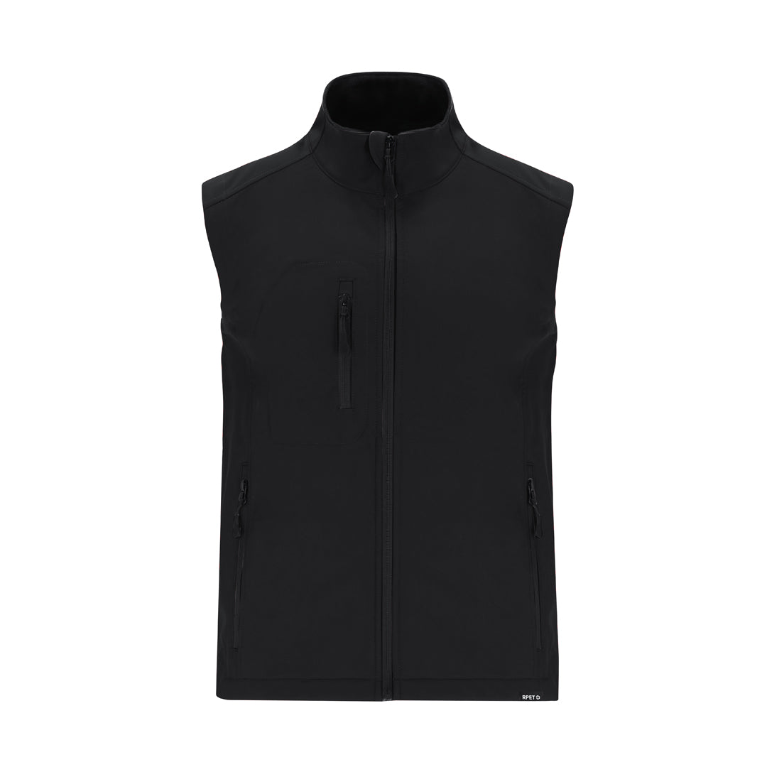 RPET Soft Shell vest made in 3 layers, 340 g/m2. With 8000mm membrane, waterproof and breathable. Exterior in Soft Shell and interior in microe polar fleece in black. With outside pocket on right chest and two side pockets with zips. With central zip and inverted zips on pockets, including black drawstring pullers. Matching chin protector and adjustable waistband, with elastic band and stopper. RPET label on the trim of the garment.