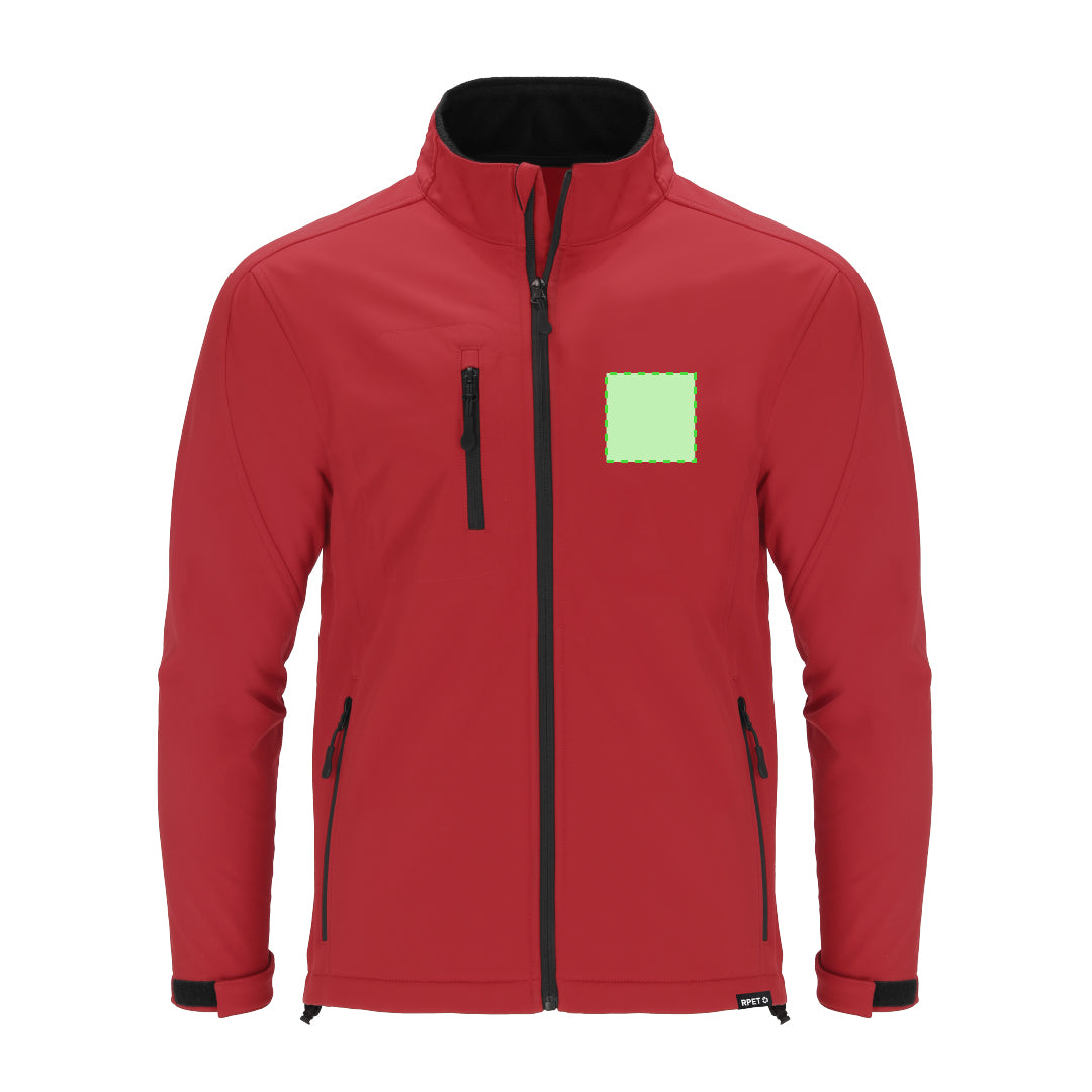 RPET Soft jacket made in 3 layers, 340 g/m2. With 8000mm membrane, waterproof and breathable. Exterior in Soft Shell and interior in microe polar fleece in black. With outside pocket on right chest and two side pockets with zips. With central zip and inverted zips on pockets, including black drawstring pullers. Raglan sleeves with velcro fastening system on the cuff in black. Matching chin protector and adjustable waistband, with elastic band and stopper. RPET label on the trim of the garment.