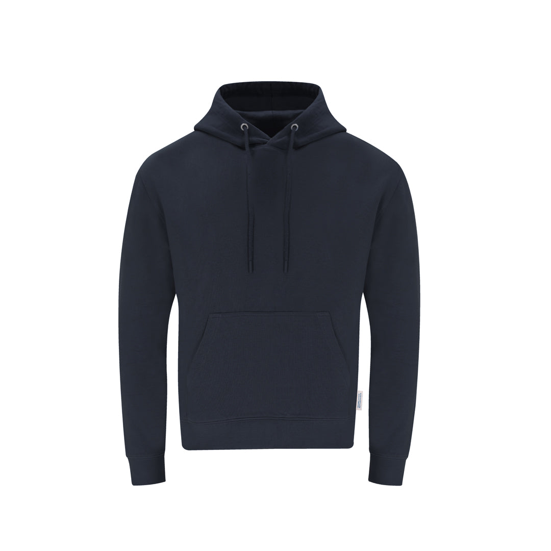 Unisex hoodie in Organic Cotton and Recycled Polyester, in soft 280g/m2 fleece. With double layer lined hood, adjustable round drawstrings - with matching stoppers - and metal eyelets. Elastane ribbed cuffs and waistband, and front kangaroo pocket. Reinforced seam cover on collar, with distinctive eco label.