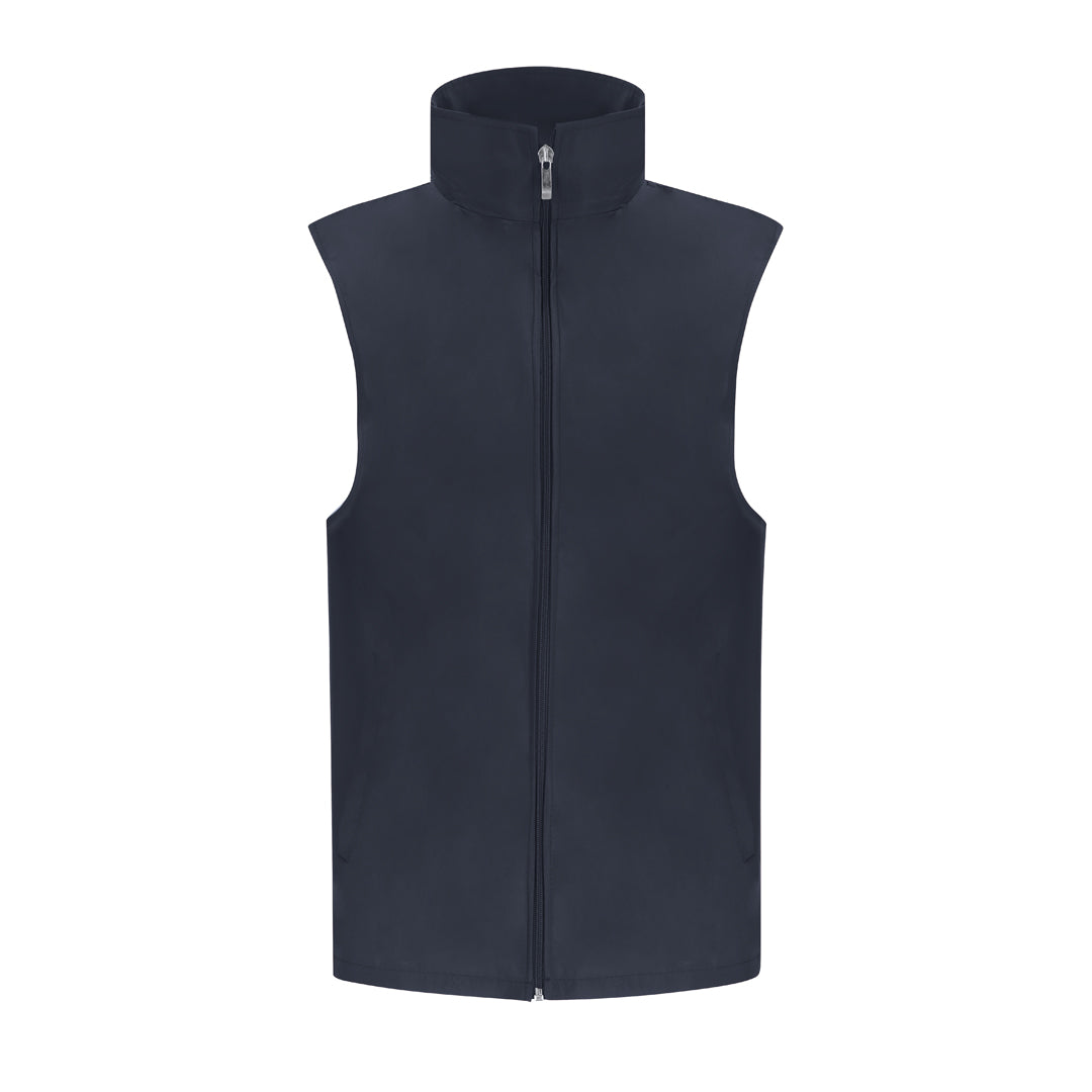 Unisex vest in lightweight, breathable fabric with white mesh lining. Matching front zip and silver puller, with an outside pocket on each side.