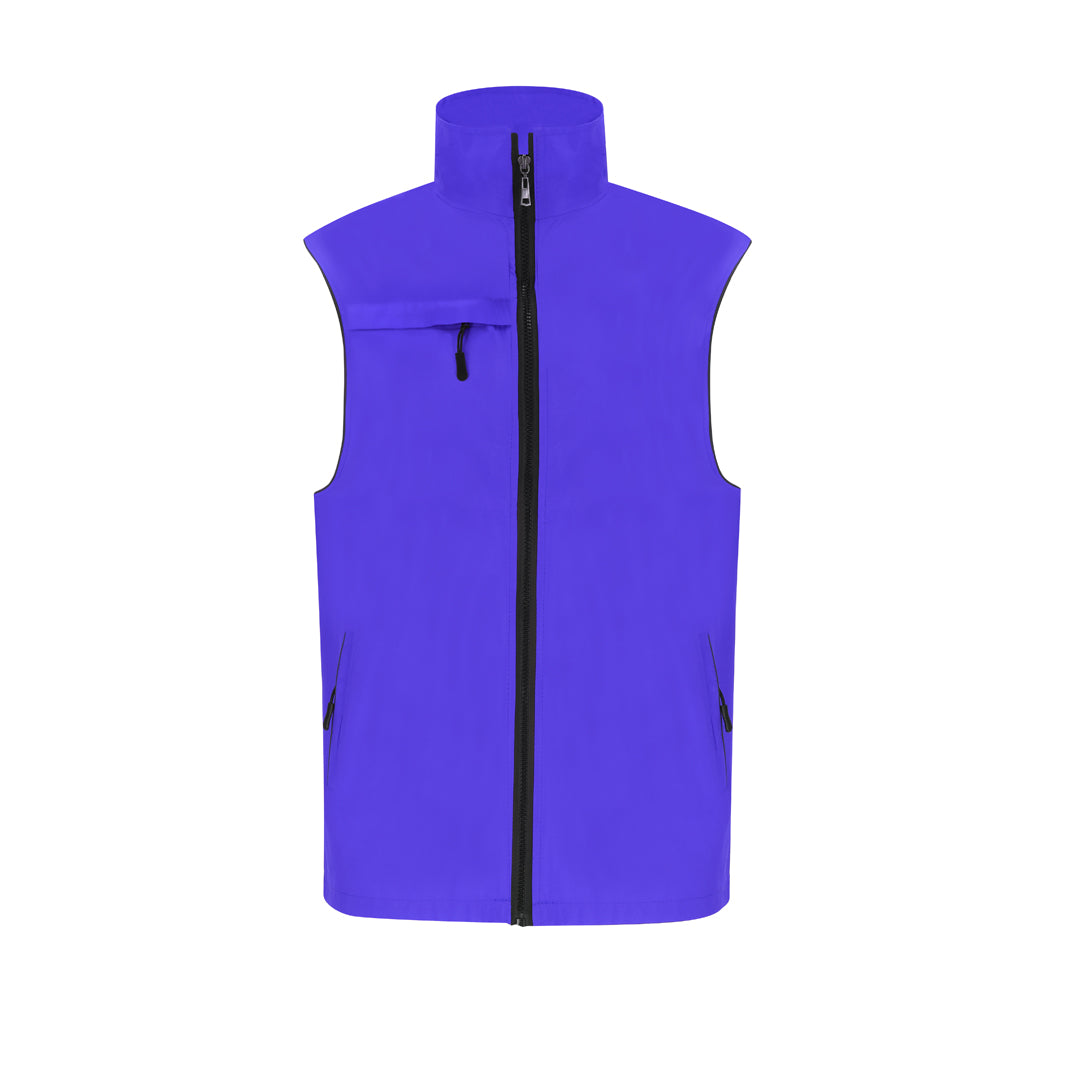Unisex vest in lightweight, breathable fabric with white mesh lining. Black front zip and silver zip puller. Including an outside pocket on the right chest and two side pockets with black zips and pullers. Features a half-moon on the inside of the collar.
