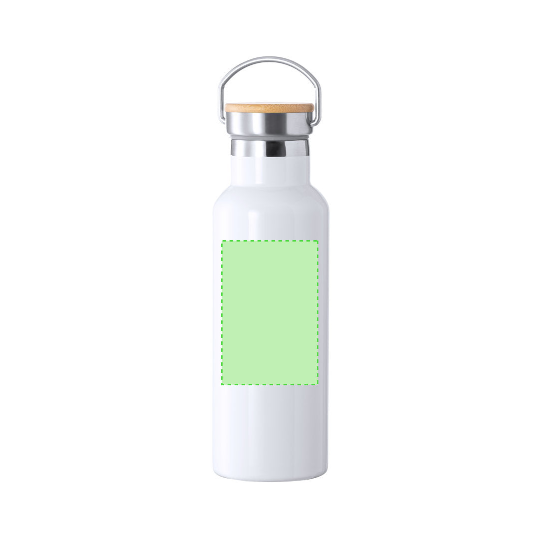 500 ml capacity thermal bottle, made in stainless steel with double wall and specially designed for sublimation printing. Gloss white finish with matching screw cap in stainless steel, with bamboo detail and integrated handle. BPA free and presented in an individual box with kraft design.Instruction manual available in Spanish and English.