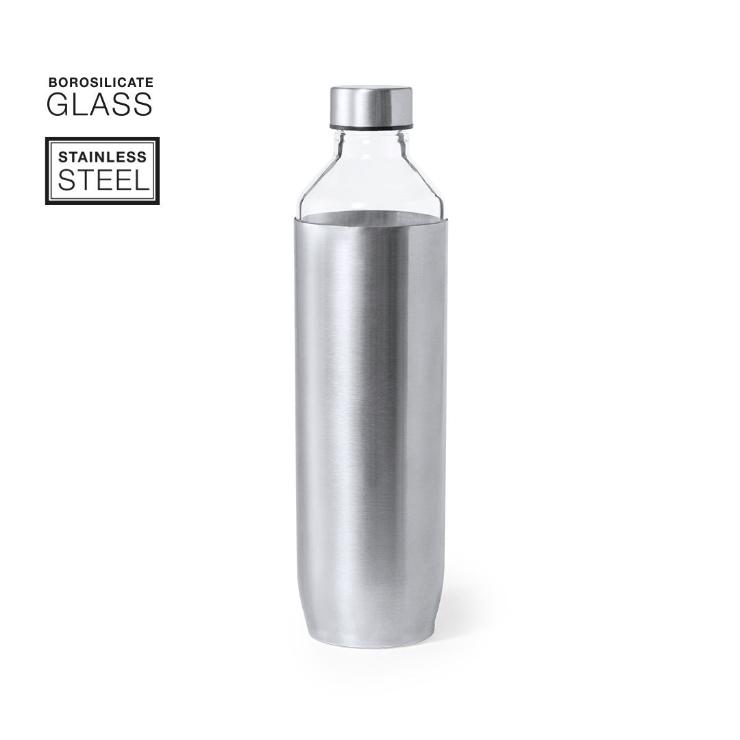 High quality design bottle, 850 ml capacity. Made of borosilicate glass, which offers exceptional resistance, aesthetic and durability, extending its useful life and allowing it to be reused countless times. Stainless steel cap and body cover. Presented in an attractive design box.