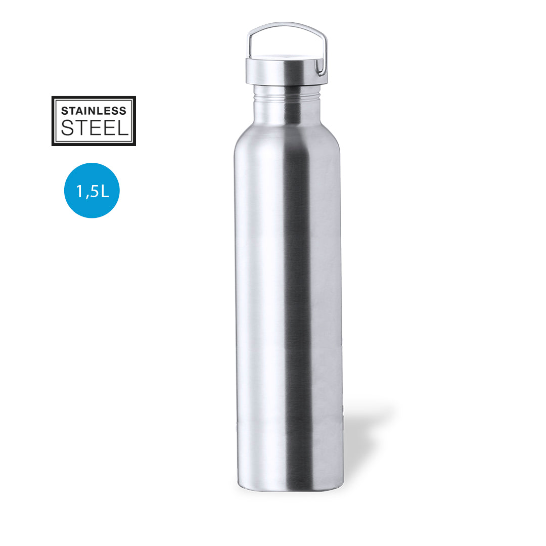 Jumbo size, 1,5 l capacity bottle, made in stainless steel with glossy finish. With matching, original screw cap in stainless steel, and integrated handle. BPA free and presented in an individual box with kraft design.Instruction manual available in Spanish and English.