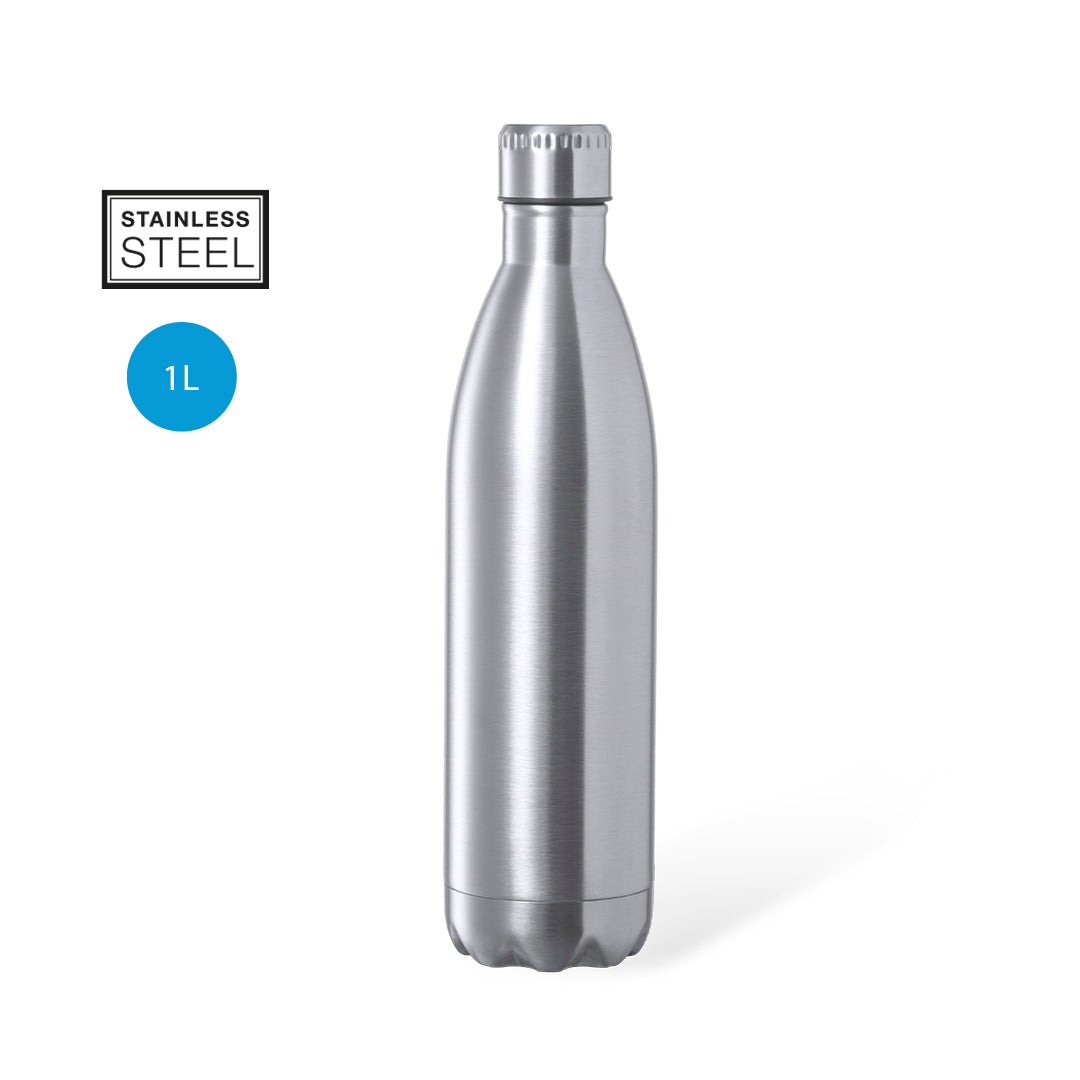 1 l capacity bottle, in stainless steel with shiny finish. With matching screw cap in stainless steel, BPA free. Presented in an individual box with kraft design.Instruction manual available in Spanish and English.