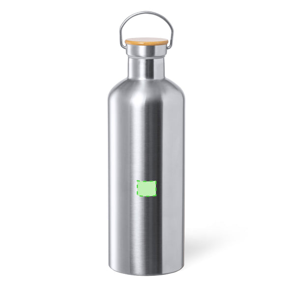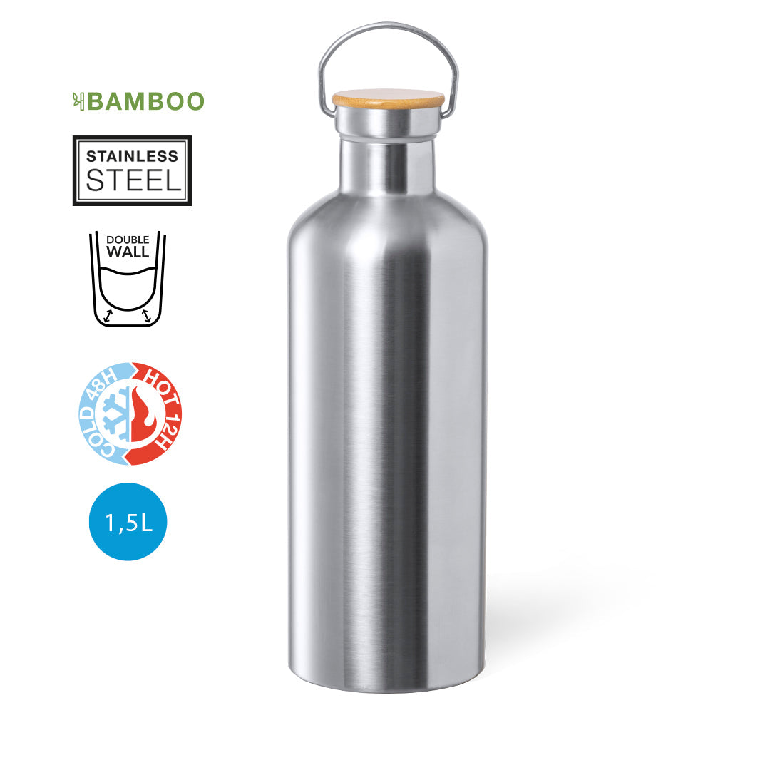 Jumbo size, 1,5 l capacity thermal bottle, made in double wall stainless steel with matte finish. Including original stainless steel screw cap with bamboo detail and integrated handle. BPA free and presented in an individual box with kraft design.