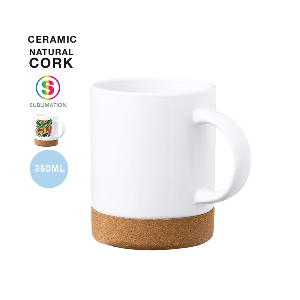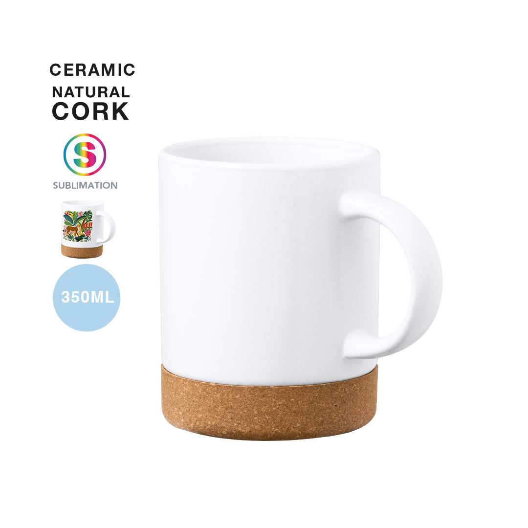 Sublimation mug with 350 ml capacity. Distinguished design in a combination of ceramic and cork, and specially designed for sublimation printing. Presented in an individual box with kraft finish.Made with plant-based elements to promote the use of natural raw materials and reduce polluting emissions.