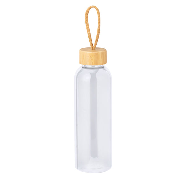 Bottle made of RPET with a capacity of 650 ml, BPA free. Bamboo screw cap, with braided carrying string. Available in a wide range of colours and individually packaged in a paper bag.