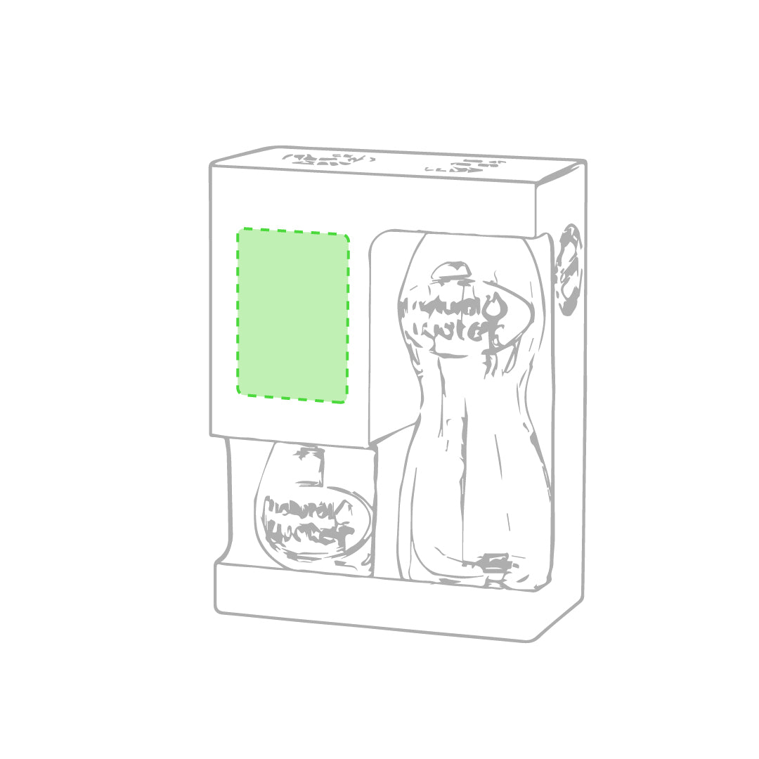 Nature line set of 2 glasses of 400 ml and a bottle of 1l. Made in Europe from recycled glass with GRS certification (Global Recycled Standard) confirming the recycled origin of the material used in the manufacture of the product. Bottle with metal screw-on lid and set presented in a recycled cardboard box with window.