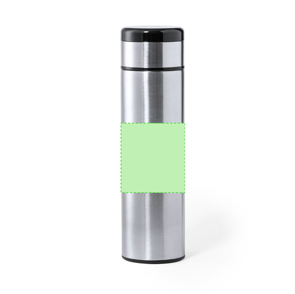Stainless steel thermos flask of 420 ml capacity with touch screen temperature gauge integrated in the cap (button cell included). With double wall for better and more durable temperature conservation. Infusor included and easy opening system with screw. Available in silver colour and presented in an attractive design box.