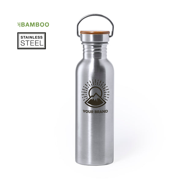 800ml, nature line bottle. Stainless steel body and bamboo cap with metal carrying handle. Presented in an attractive eco-design box.
