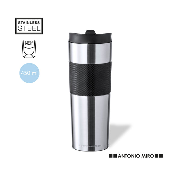Antonio Miró insulated cup for tabletop use. Made of double-walled stainless steel and 450ml capacity. It is ideal for your desk, table, or any surface where you can enjoy your favorite drink. Matt finish, with elegant central strip and brand logo on the bottom. BPA-free, easy-open lid dispenser. Presented in an elegant individual black box with Antonio Miró logo.