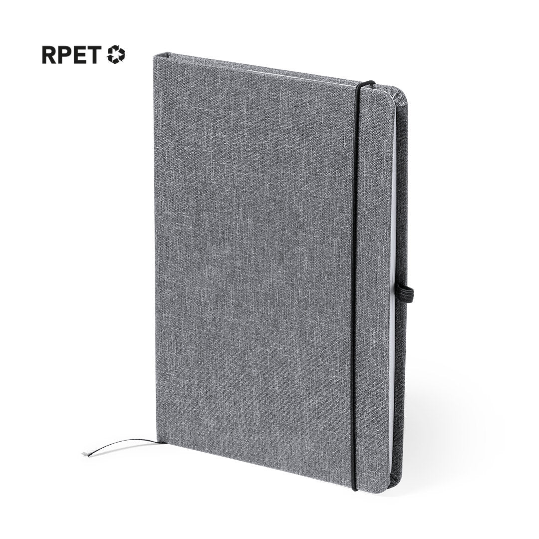 Notepad in nature line. With rigid covers made of RPET, made from recycled plastic, to promote the reuse of plastic waste and contribute to the sustainability of the planet. Inside with 100 sheets of single-stripe layout. Includes bookmark, elastic closure and matching pen holder. Includes RPET logo on back cover.