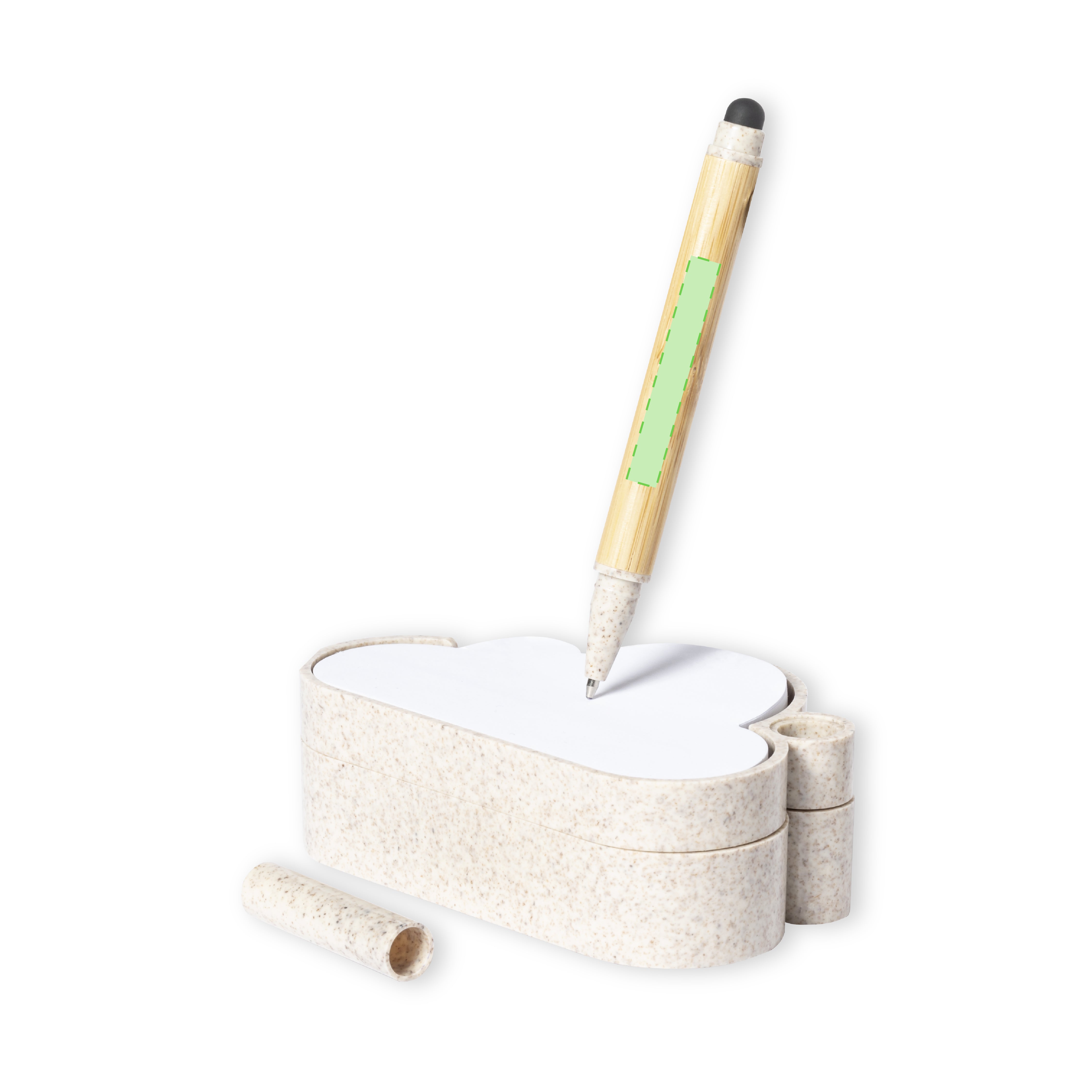 Nature line, seed notepad holder with original cloud design. Including: Notepad with 80 white notes in the shape of a cloud.Base with pen holder and two compartments, with a sheet of seed paper included. Made of wheat straw, to promote the use of natural raw materials and reduce pollutant emissions.Ball pen pointer with body made of bamboo cap and details in wheat straw. In blue ink.Set presented in an individual box with kraft design, with instruction manual in English and Spanish.