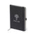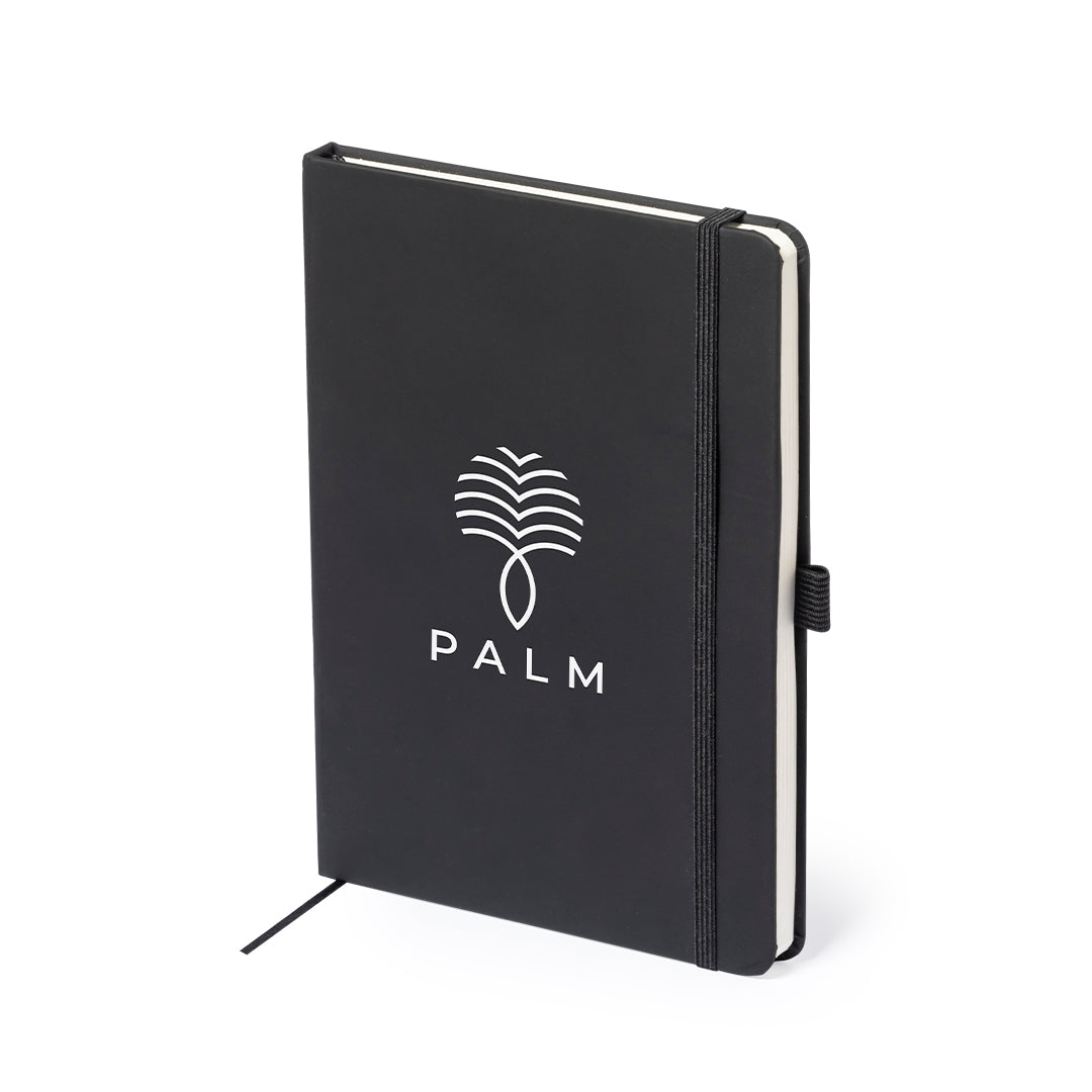 Notepad made of PU leather with elegant black finish. With hard covers, matching color bookmark and elastic band. Inside with 100 sheets of single-stripe layout and ball pen holder (ball pen not included).
