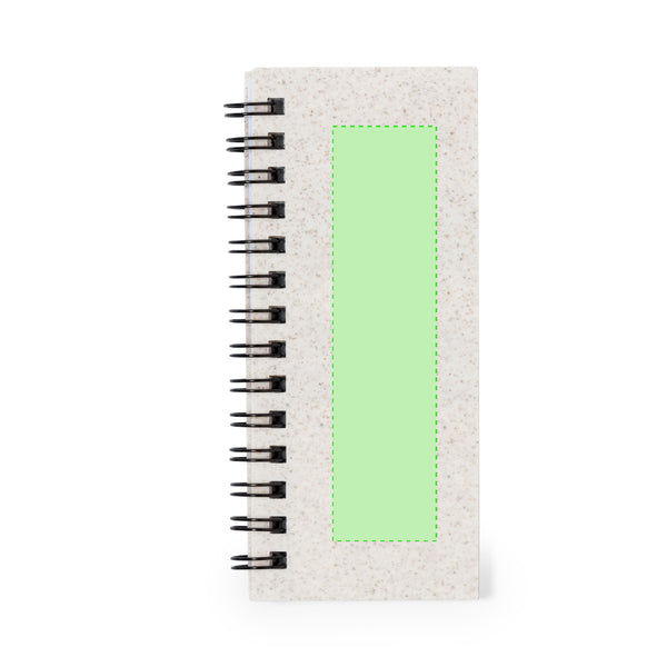 Notepad with wheat straw covers. With wheat straw logo on the back cover. Includes:30-sheet white ring binder with single-stripe layout and recycled stamp on both sides.25 medium sticky notes.125 mini sticky notes in various colours. Made with vegetable elements to promote the use of natural raw materials and reduce pollutant emissions.Presented in an individual recycled bag.